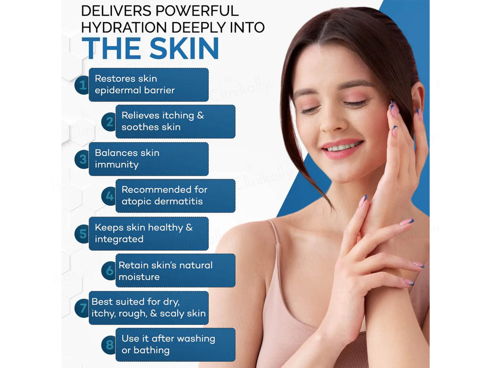 - Alleviates dryness and discomfort from conditions like eczema and dermatitis.