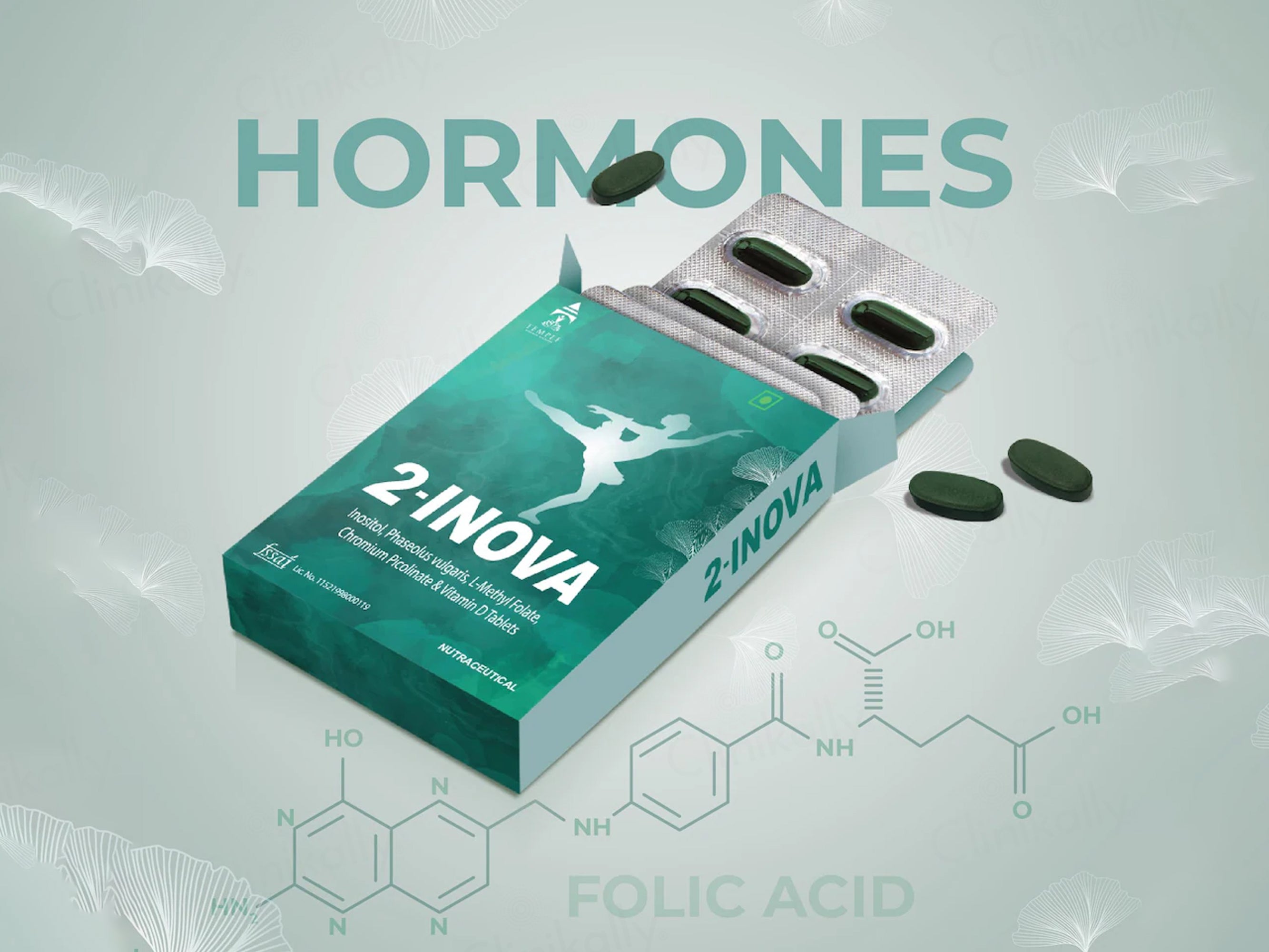 2-Inova Myo-Inositol Tablet is a nutraceutical formulation designed to support hormonal balance, ovarian health, and metabolic function, particularly in women with conditions like PCOS. Each film-coated tablet combines the benefits of Myo-Inositol and D-Chiro Inositol to enhance insulin sensitivity and restore ovulatory function, along with Phaseolus Vulgaris Extract to aid in carbohydrate metabolism and weight control. It also contains L-Methyl Folate for improved folate absorption and reproductive health, Chromium Picolinate to regulate blood sugar levels, and Vitamin D2 to strengthen bone and immune health. This synergistic blend helps manage hormonal imbalance, improve fertility parameters, and support overall metabolic well-being when taken as part of a balanced lifestyle.