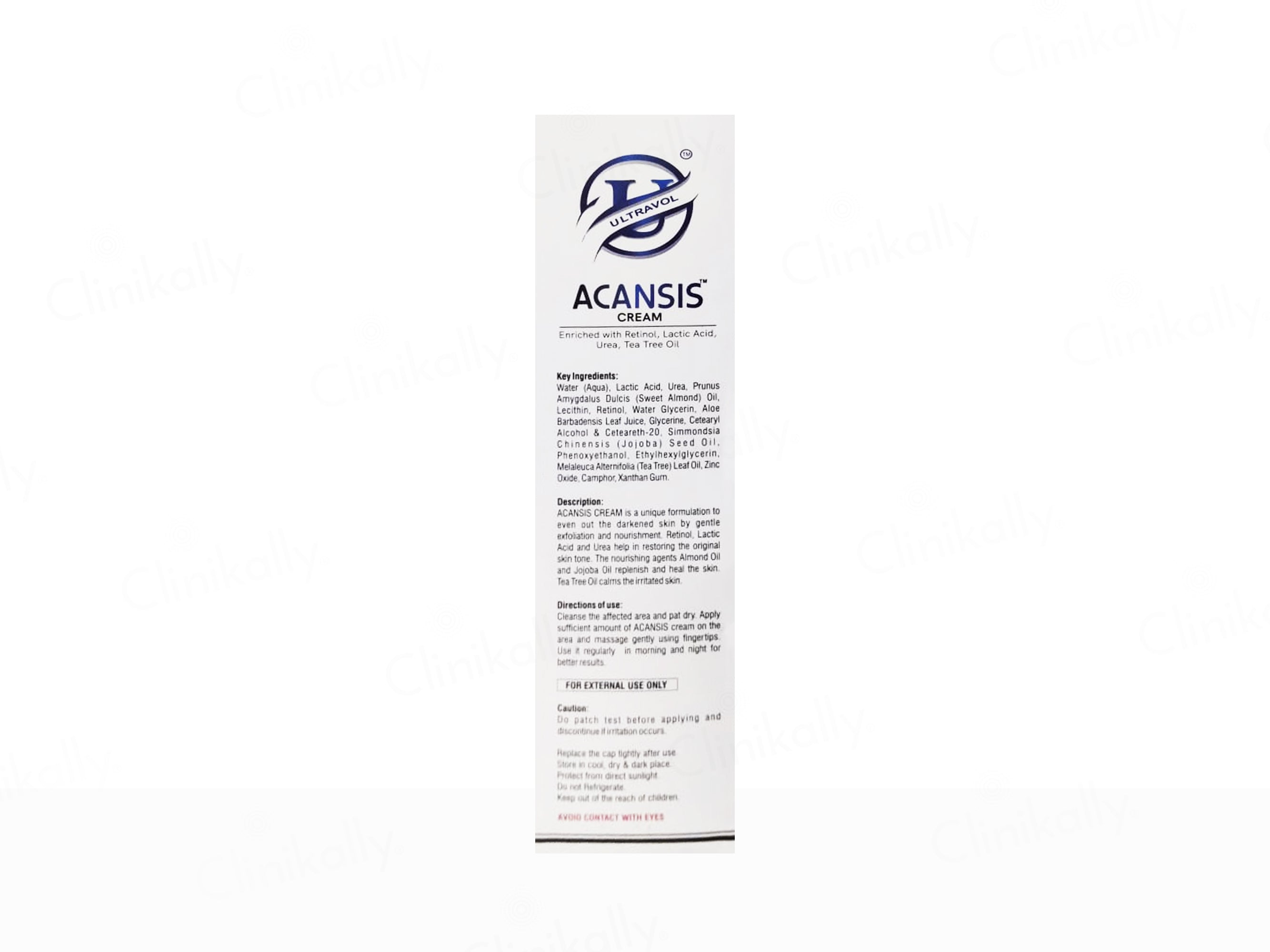 Acansis Cream is a dermatologist-formulated moisturizing cream enriched with Retinol, Lactic Acid, Urea, and Tea Tree Oil to provide intensive hydration, gentle exfoliation, and antimicrobial protection for dry, rough, or acne-prone skin. This paraben-free formula promotes skin renewal by reducing fine lines and pigmentation with Retinol, smoothens texture and boosts collagen with Lactic Acid, locks in moisture and repairs the barrier with Urea, and combats blemishes with Tea Tree Oil for clearer, softer, and healthier skin suitable for daily use on face and body.