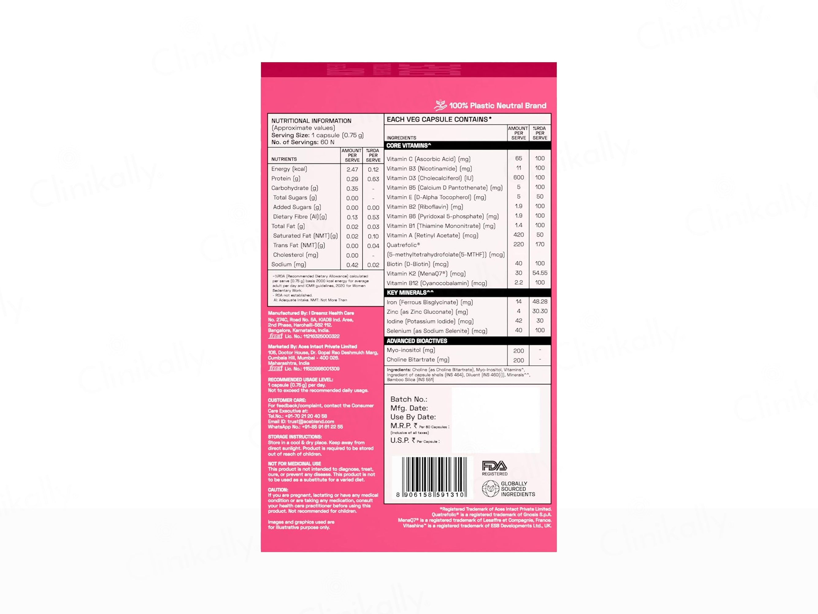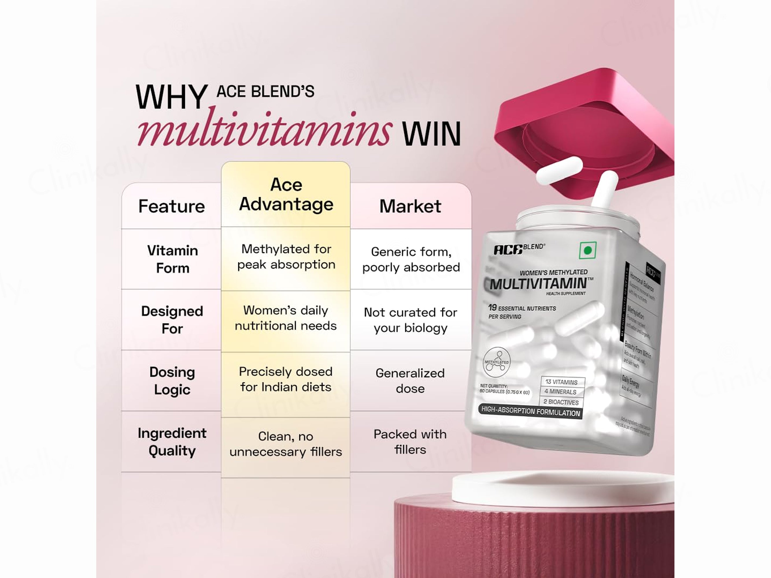 Ace Blend Women’s Methylated Multivitamin Health Supplement Veg Capsule is a comprehensive daily nutrition formula designed to support women’s overall health, hormonal balance, energy, immunity, bone strength, and metabolic function through a blend of bioavailable vitamins, essential minerals, and advanced bioactives. It is formulated with methylated nutrients for better absorption, featuring Quatrefolic® (5-MTHF) as the active folate form, along with key vitamins including Vitamin C, Vitamin D3, Vitamin K2 (MK-7), Vitamin E, Vitamin A, and a complete spectrum of B-Vitamins such as B1, B2, B3, B5, B6, Biotin, and Vitamin B12 to support energy, metabolism, skin, hair, and nerve health. Essential minerals like Iron (as Ferrous Bisglycinate), Zinc, Iodine, and Selenium help support menstrual health, immunity, thyroid function, and antioxidant defense, while advanced bioactives Myo-Inositol and Choline Bitartrate contribute to hormonal balance, fertility support, brain function, and cellular health. Designed for daily use, this vegetarian capsule provides balanced nutritional support tailored to women’s unique needs when taken consistently as part of a healthy lifestyle.