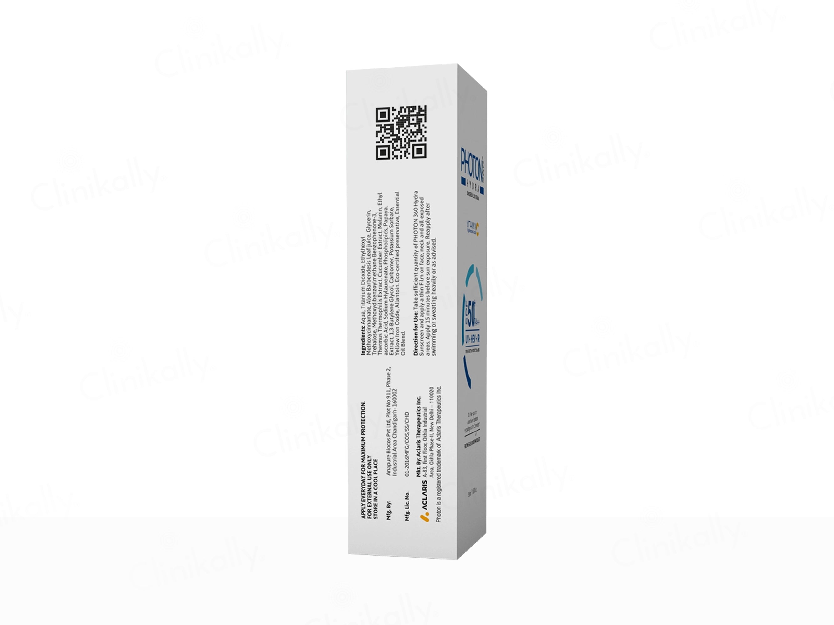 - Apply Aclaris Photon 360 Hydra Sunscreen Fluid Cream SPF 50+ in a sufficient quantity on exposed areas at least 15 minutes before sun exposure and reapply as required, especially after swimming or sweating.
