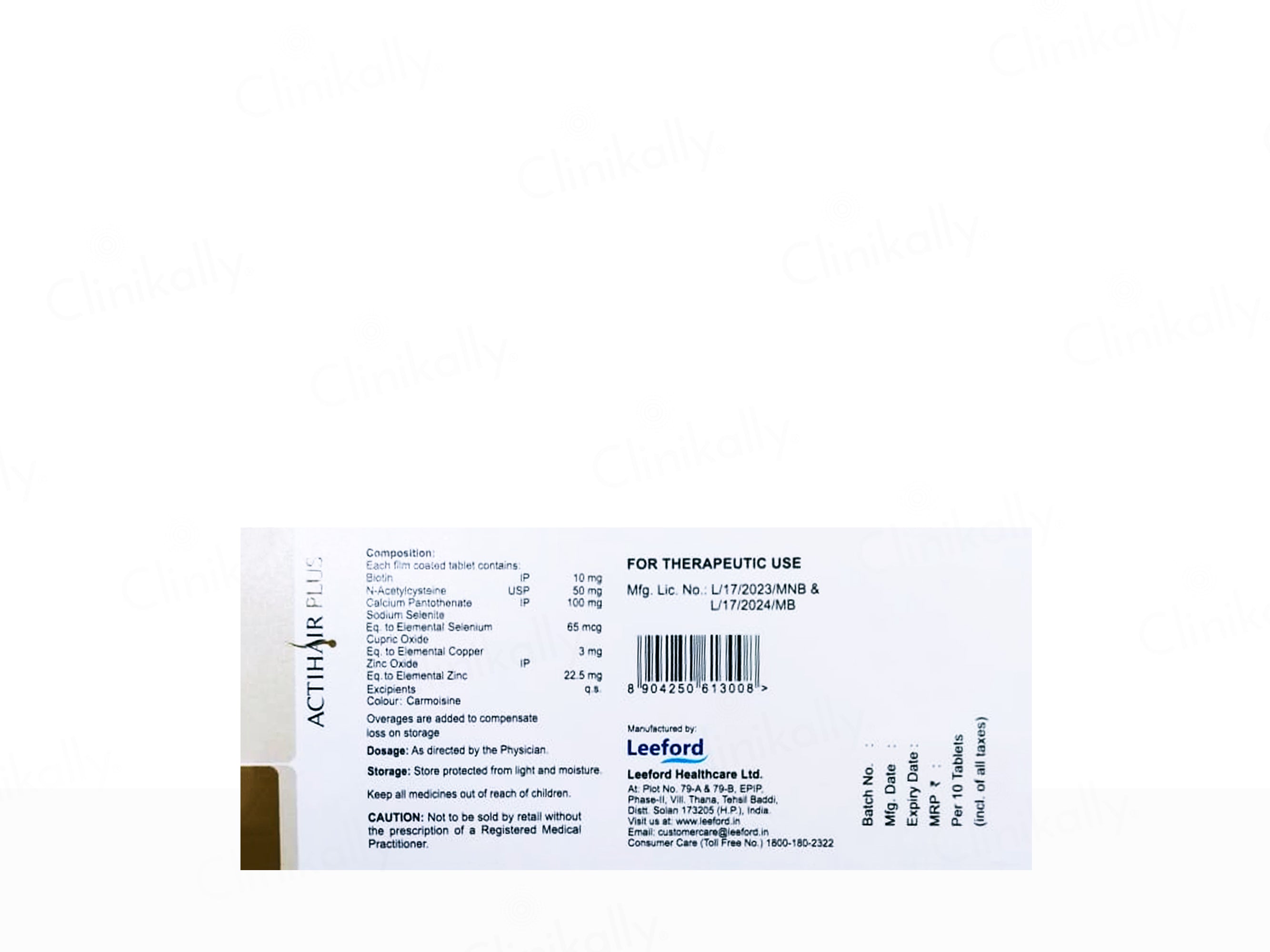 Actihair Plus Tablet is a scientifically formulated nutritional supplement that supports hair growth, reduces hair thinning, and strengthens hair structure. Enriched with essential vitamins and trace minerals like Biotin, Zinc, and Selenium, along with antioxidants such as N-Acetylcysteine, it nourishes hair follicles and improves scalp health. Regular use promotes thicker, shinier, and healthier hair. Suitable for both men and women facing hair fall due to nutritional deficiencies or stress.