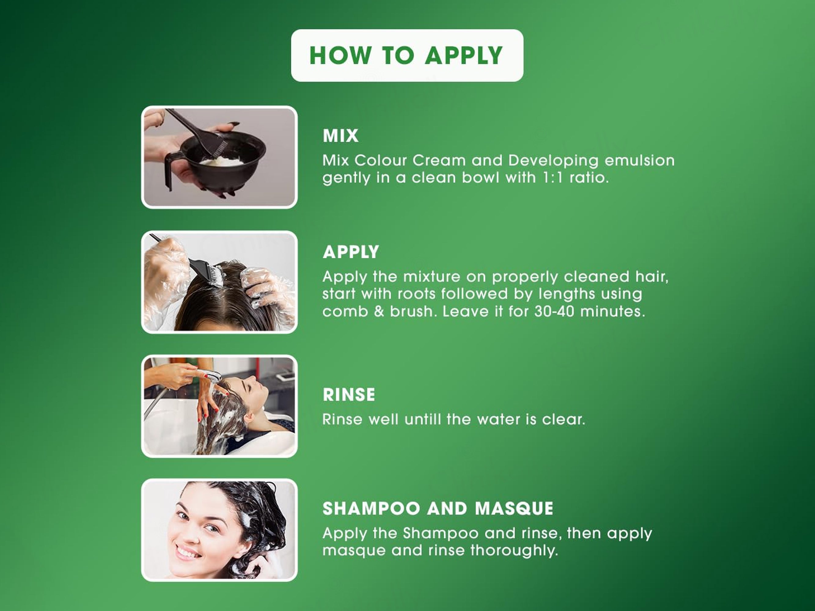 • Apply the color cream and developing emulsion as per instructions, using the included brush and comb for application. Follow with Keratin Shampoo and Mask for the best results.