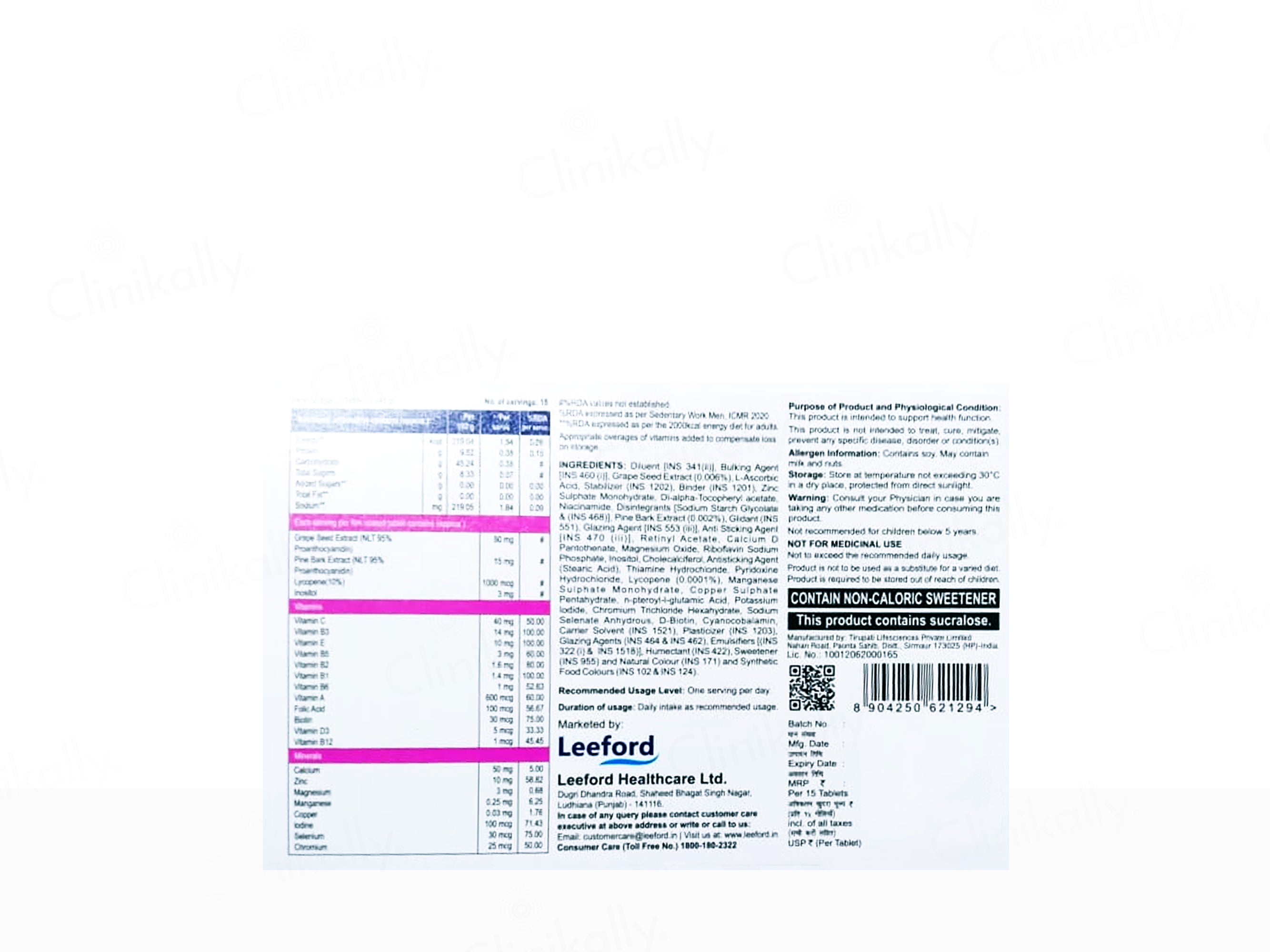 Adivit Nutraceutical Tablets are a multivitamin and multimineral supplement enriched with Lycopene, Grape Seed Extract, and Pine Bark Extract, designed to provide antioxidant support and promote general health. Formulated to maintain good health and well-being, it supports pregnancy, post-natal care, and helps manage cardiovascular disorders, diabetes, and chronic diseases. This tablet is ideal for daily use by adults, including pregnant and non-lactating mothers.