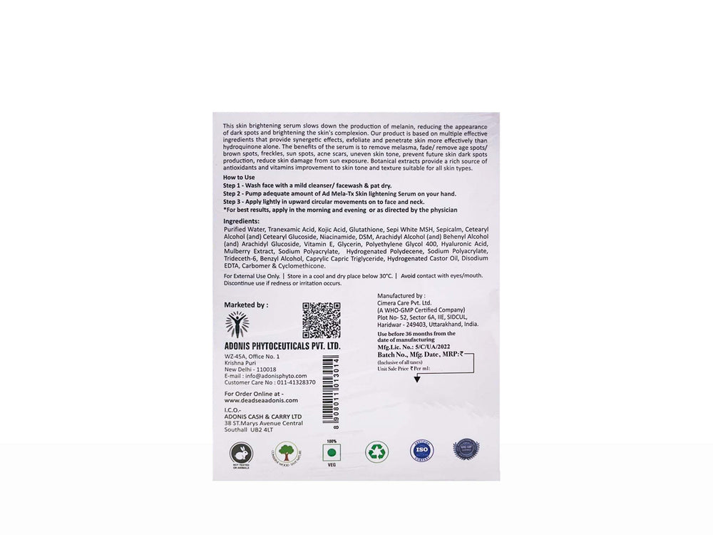Adonis AD Mela-TX Skin Lightening Serum SPF 15 is a dermatologist-developed melasma and hyperpigmentation serum that visibly fades dark spots, acne marks and sun tan. A multi-action complex of tranexamic acid, kojic acid, niacinamide, glutathione and mulberry extract slows melanin production while boosting cell turnover for clearer, even-toned skin. Hyaluronic acid, vitamin E and Dead Sea minerals hydrate and strengthen the barrier, helping prevent future discoloration. Lightweight, non-greasy and pH 5.5, this daily brightening face serum suits all skin types and is paraben-, sulphate- and colourant-free.