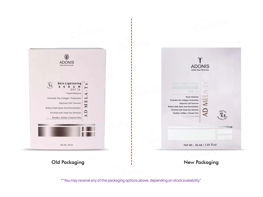 Adonis AD Mela-TX Skin Lightening Serum SPF 15 is designed to inhibit melanin production, diminishing dark spots and enhancing the skin's complexion.