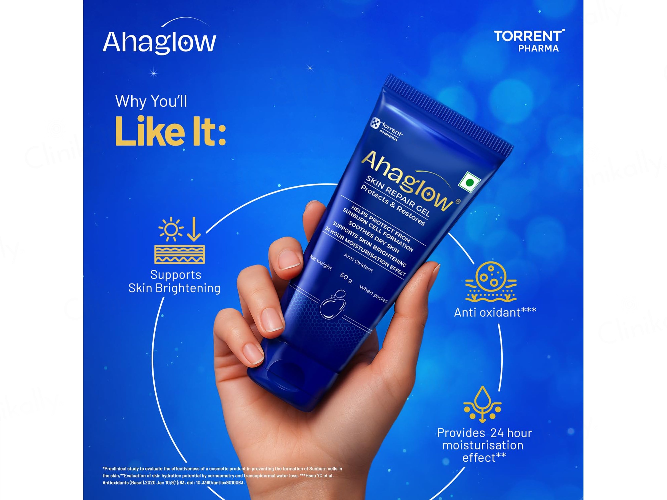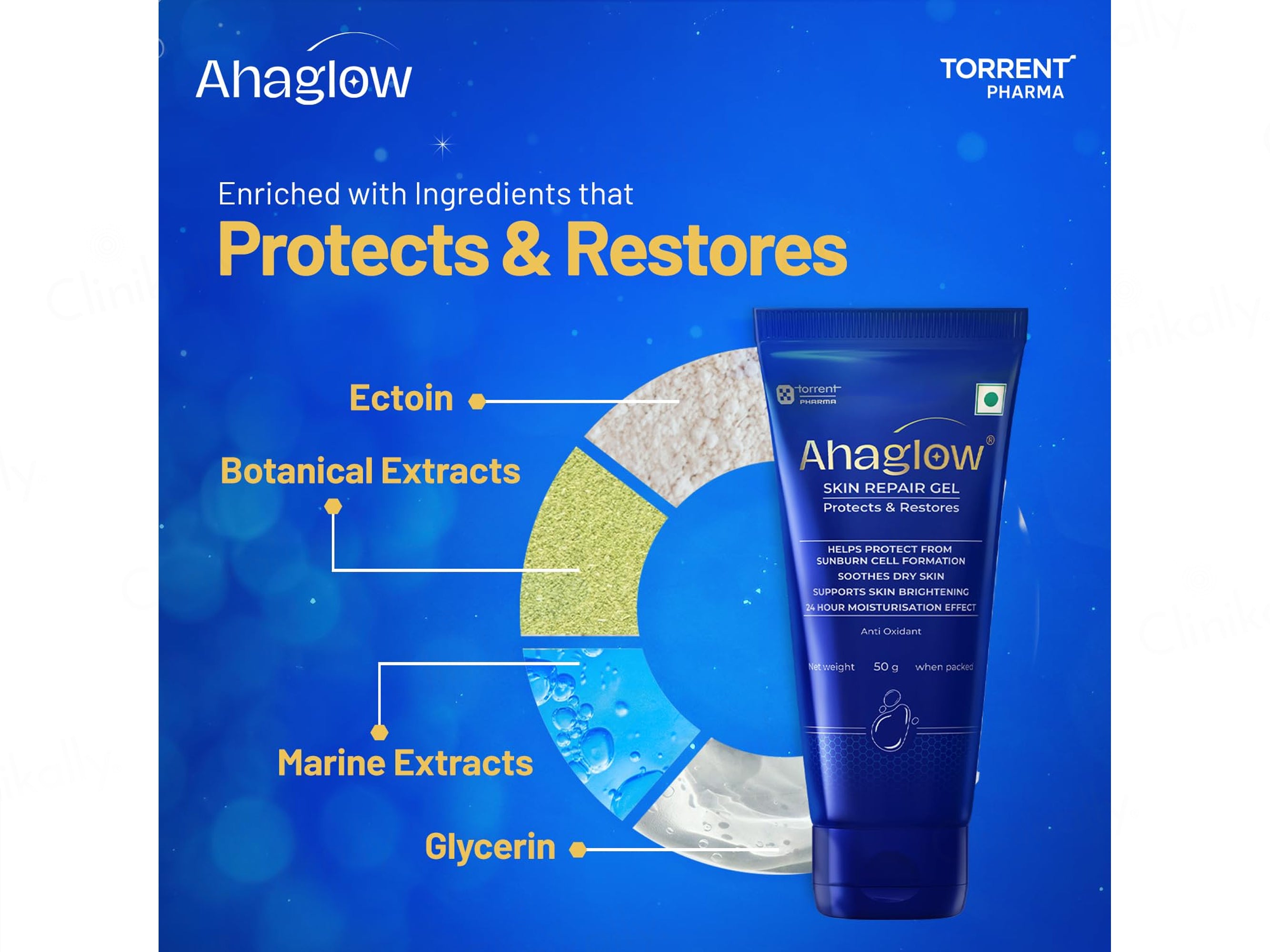 Ahaglow Skin Repair Gel helps reduce redness, tanning, burning, and dehydration by providing healing, moisturizing, anti-inflammatory, and antiseptic effects.