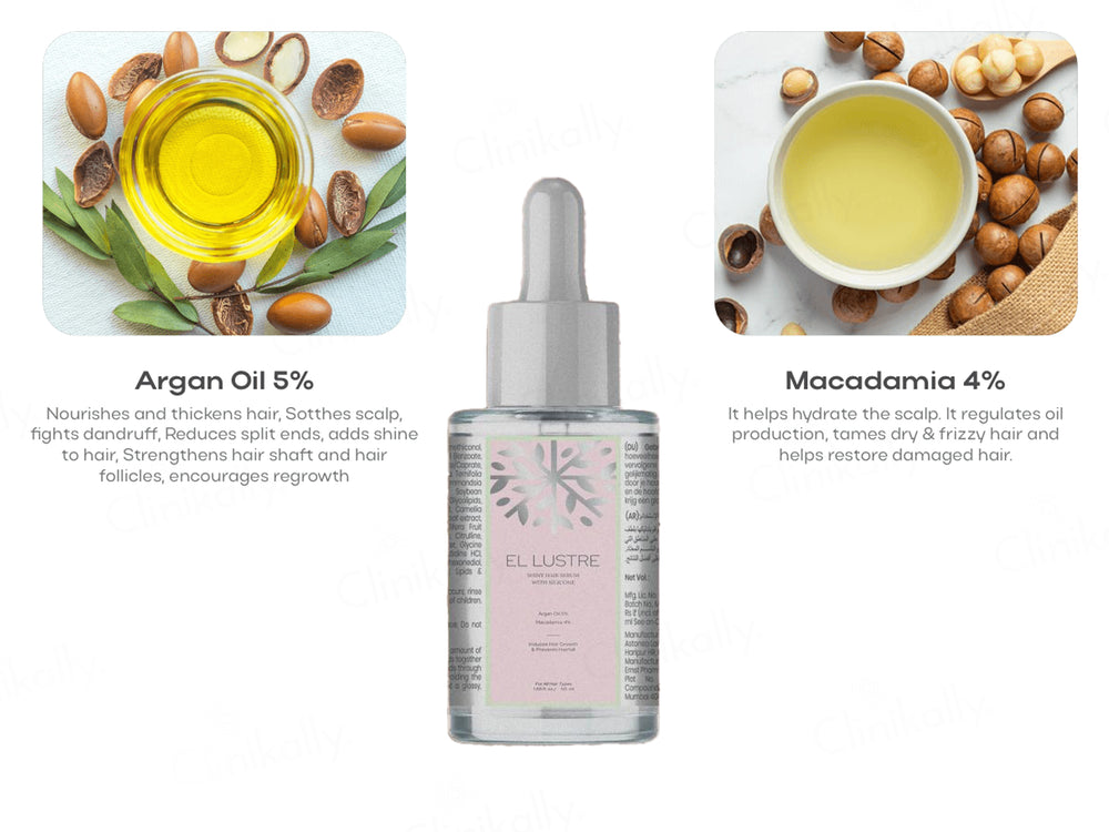 The main ingredients in Akasa Cosmetics El Lustre Shiny Hair Serum With Silicone are Argan Oil and Macadamia Oil, as seen on the packaging.