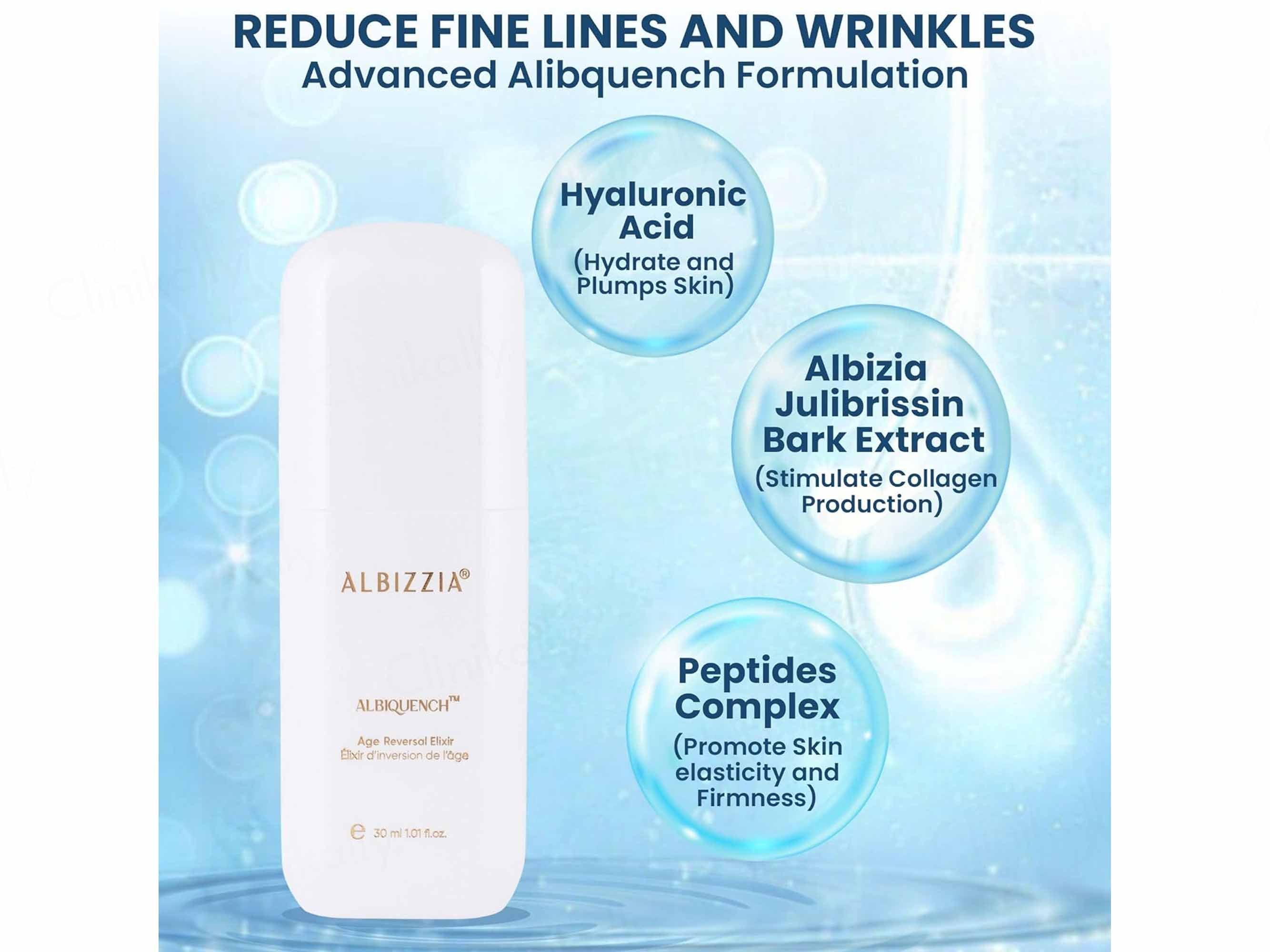 Albizzia Albiquench Age Reversal Elixir is a lightweight, age-defying skincare elixir formulated to support youthful-looking skin by improving firmness, hydration, and elasticity while helping reduce visible signs of aging through targeted skin-rejuvenating actives. The formulation is enriched with key ingredients such as Albizia Julibrissin Bark Extract, Hyaluronic Acid, and a Peptide Complex, where Albizia Julibrissin Bark Extract helps stimulate collagen production and revive tired skin, Hyaluronic Acid deeply hydrates and plumps the skin to improve smoothness, and the Peptide Complex supports skin elasticity and firmness, resulting in visibly healthier, supple, and more youthful skin with regular use.