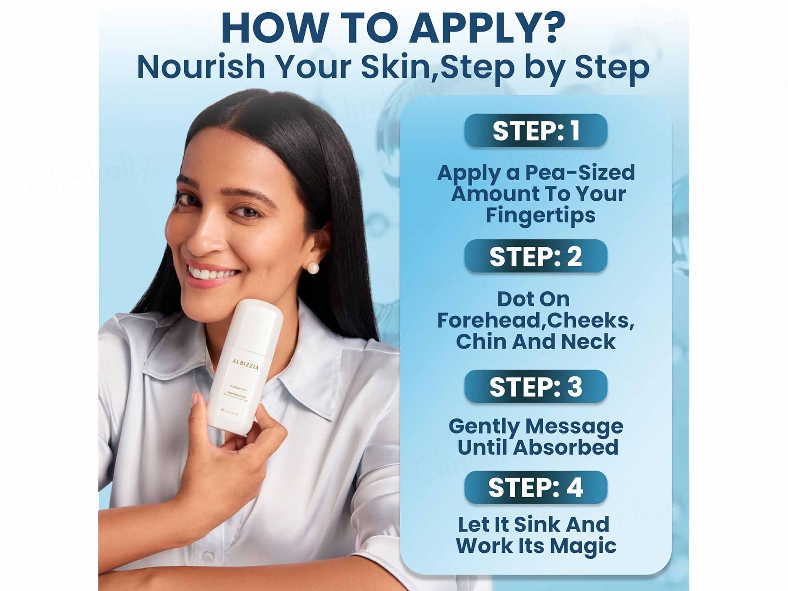 - Apply a pea-sized amount of Albizzia Albiquench Age Reversal Elixir on fingertips, dot onto the face and neck, gently massage until absorbed, and follow with Albizzia Brightening & Correcting Serum for best results.
