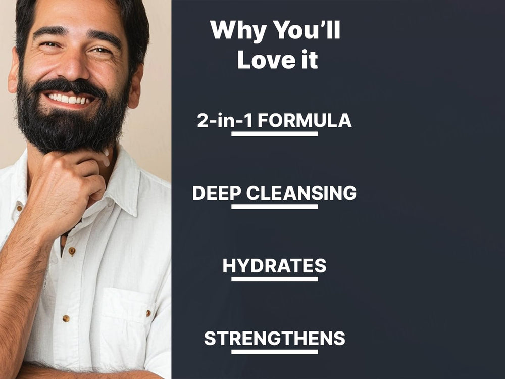 ALL MAN Beard Pro Shampoo & Conditioner is a 2-in-1 formula designed to deeply cleanse, hydrate, and strengthen beards for a soft, clean, and manageable finish. Enriched with nourishing ingredients, it reduces frizz, adds shine, and conditions hair while being gentle on the skin. The product is cruelty-free, paraben-free, sulfate-free, phthalate-free, alcohol-free, and mineral oil-free, ensuring safety for all beard types. Its foamy texture makes it easy to apply and rinse.