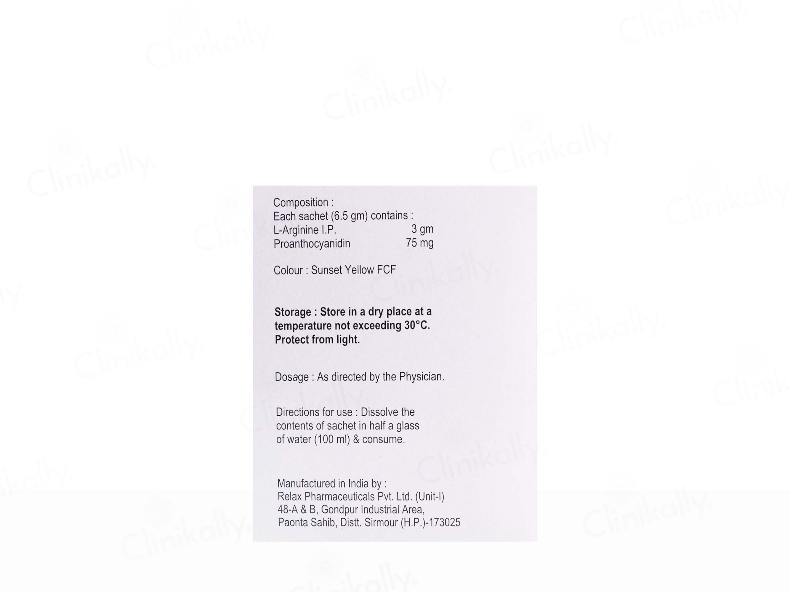 Each sachet contains L-Arginine (3g) and Proanthocyanidin (75mg).