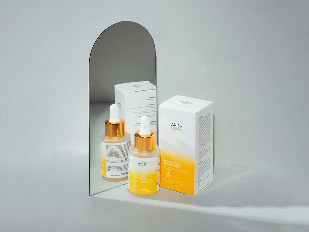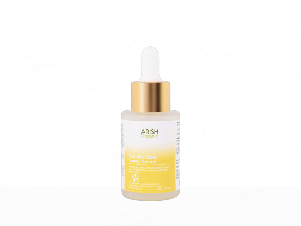 Arish Organic Propolis Elixir Repair Serum is a restorative skincare serum designed to heal, hydrate, and protect skin while promoting a radiant, healthy complexion. Formulated with propolis extract, honey extract, and niacinamide, it repairs damage, soothes irritation, and strengthens the skin barrier effectively. Its lightweight, non-greasy formula absorbs quickly, leaving skin soft and revitalized. Suitable for all skin types, this serum supports skin recovery and glow daily.