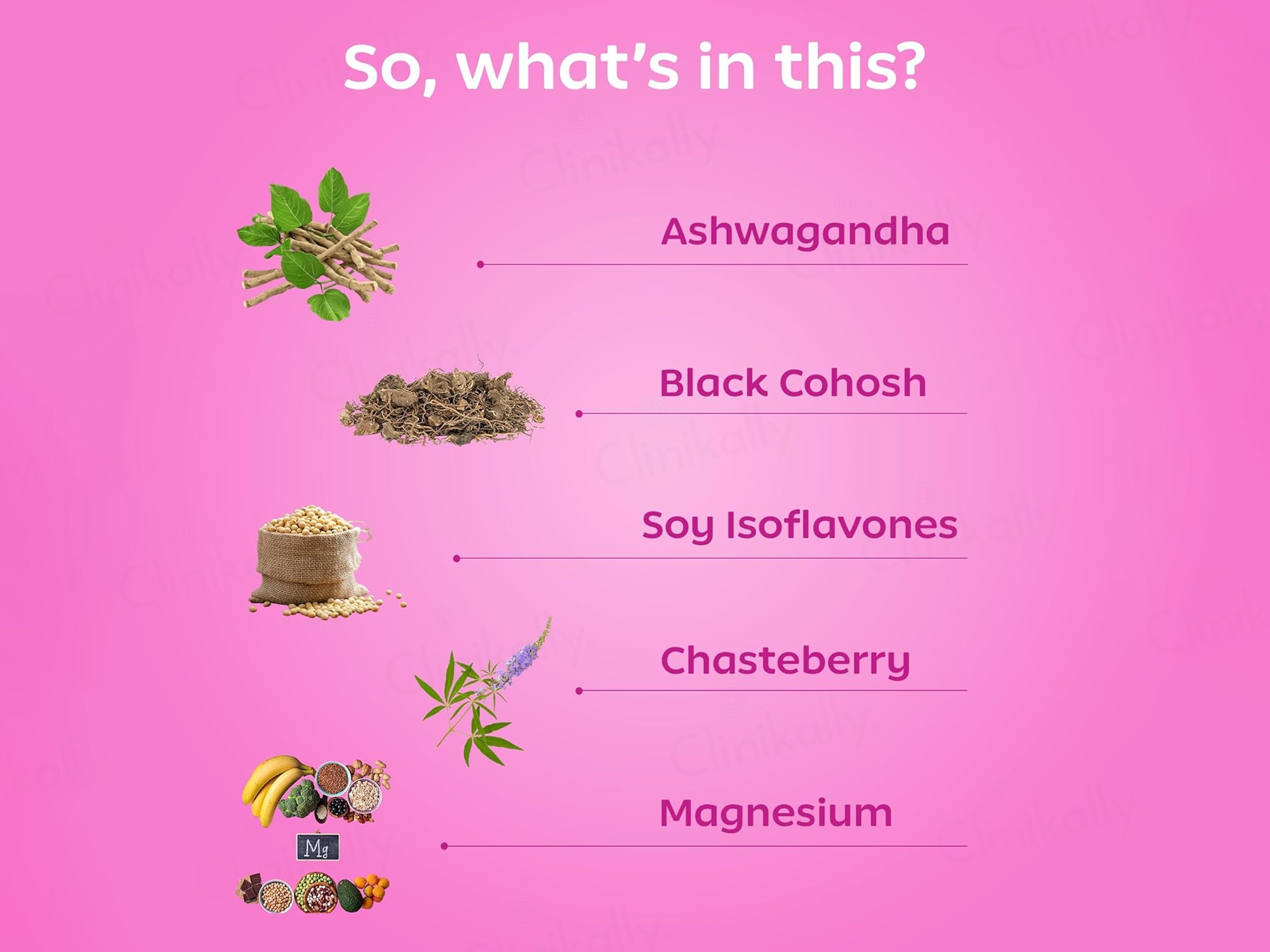 - Reduces stress and hot flashes with Ashwagandha and Black Cohosh.