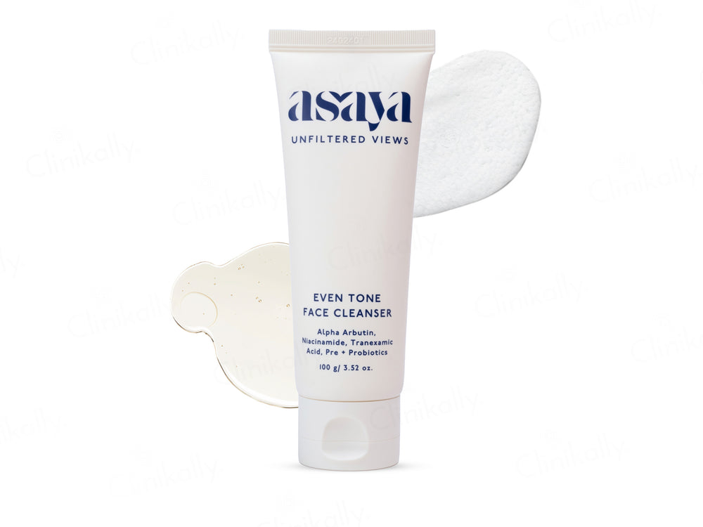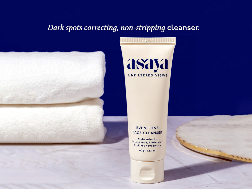 Asaya Unfiltered Views Dark Spot Removal Even Tone Face Cleanser is a luxurious hydrating cream cleanser formulated with Alpha Arbutin, Niacinamide, Tranexamic Acid, and Pre+Probiotics to gently cleanse, reduce the appearance of dark spots and blemishes, and strengthen skin resilience without stripping moisture, leaving the skin soft, even-toned, and radiant.