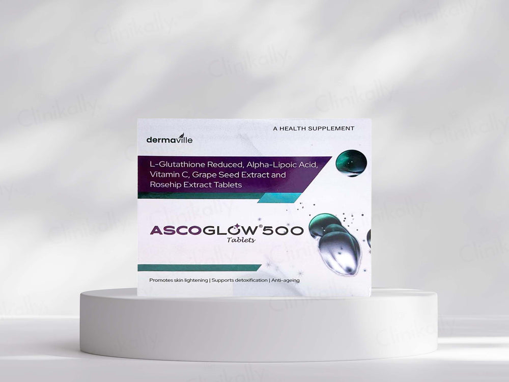 Ascoglow 500 Tablet is used to improve skin tone, lighten pigmentation, and support skin health.