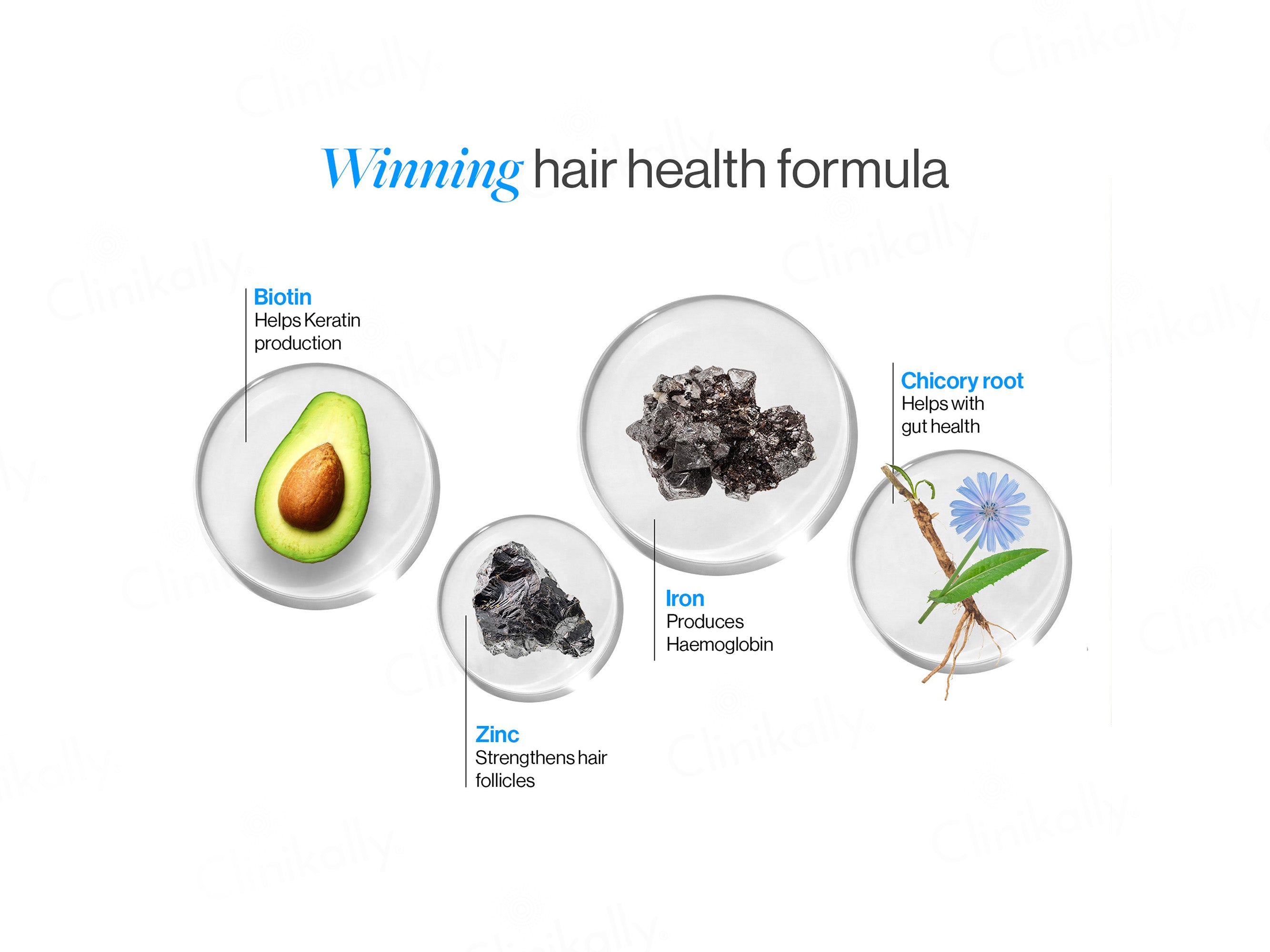 Be Bodywise Hair Health Gummies contain Chicory Root Extract, Beta-Sitosterol, Vitamin H (Biotin), Vitamin B6 (Pyridoxine HCl), Iron (Ferrous Fumarate), Grape Seed Extract, Vitamin B12 (Cyanocobalamin), Vitamin B9 (Folic Acid), Vitamin D2 (Ergocalciferol), Zinc Citrate Dihydrate, Sesbania Extract, Vitamin A (Retinol Palmitate), Vitamin C (Ascorbic Acid), and Vitamin E (Tocopherol Acetate).