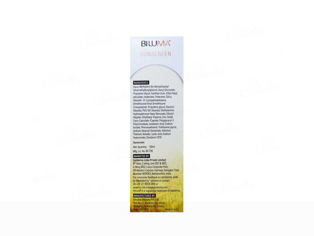 Biluma Broad Spectrum Sunscreen SPF 50+ PA++++ is a highly protective sunscreen designed to shield skin from harmful UVA and UVB rays. Formulated with a blend of physical and chemical filters, it offers robust defense against sun damage and photoaging. This sunscreen is enriched with antioxidants and skin-soothing ingredients that prevent irritation, making it suitable for all skin types, including sensitive skin. Its lightweight, non-greasy formula absorbs quickly, leaving no white cast, ensuring a comfortable wear throughout the day.