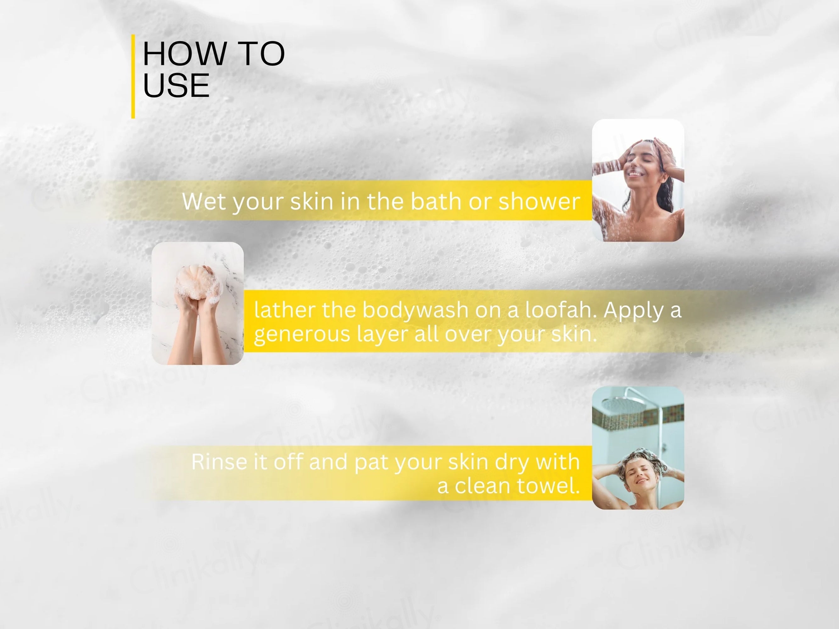 - Apply a generous amount of body wash to a loofah or directly onto the skin.