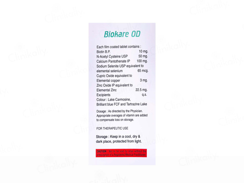 Biokare OD Tablet is a comprehensive dietary supplement formulated to support overall health and well-being. This tablet combines a range of essential vitamins, minerals, and antioxidants designed to address nutritional deficiencies and enhance physical and mental vitality. Ideal for individuals seeking to boost their energy levels, improve immune function, and maintain overall wellness, Biokare OD Tablet provides balanced nutrition that supports the body's natural processes. Regular use of this supplement helps to improve stamina, reduce fatigue, and promote overall health.