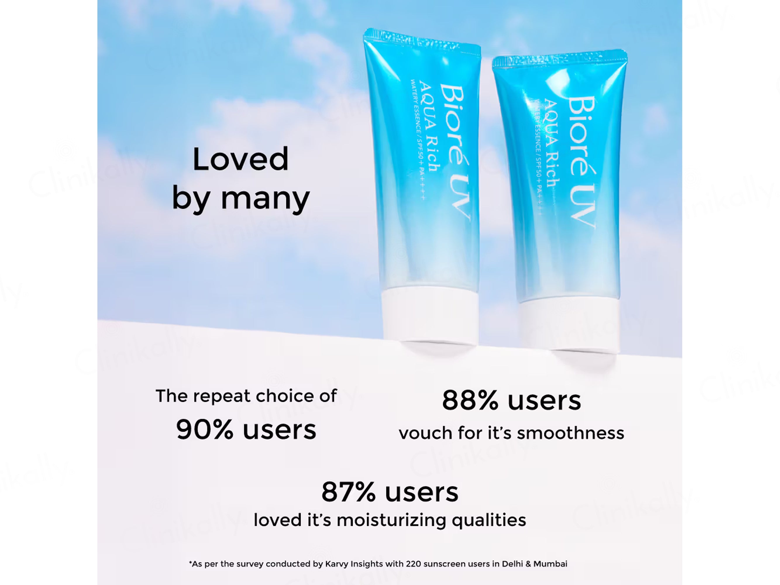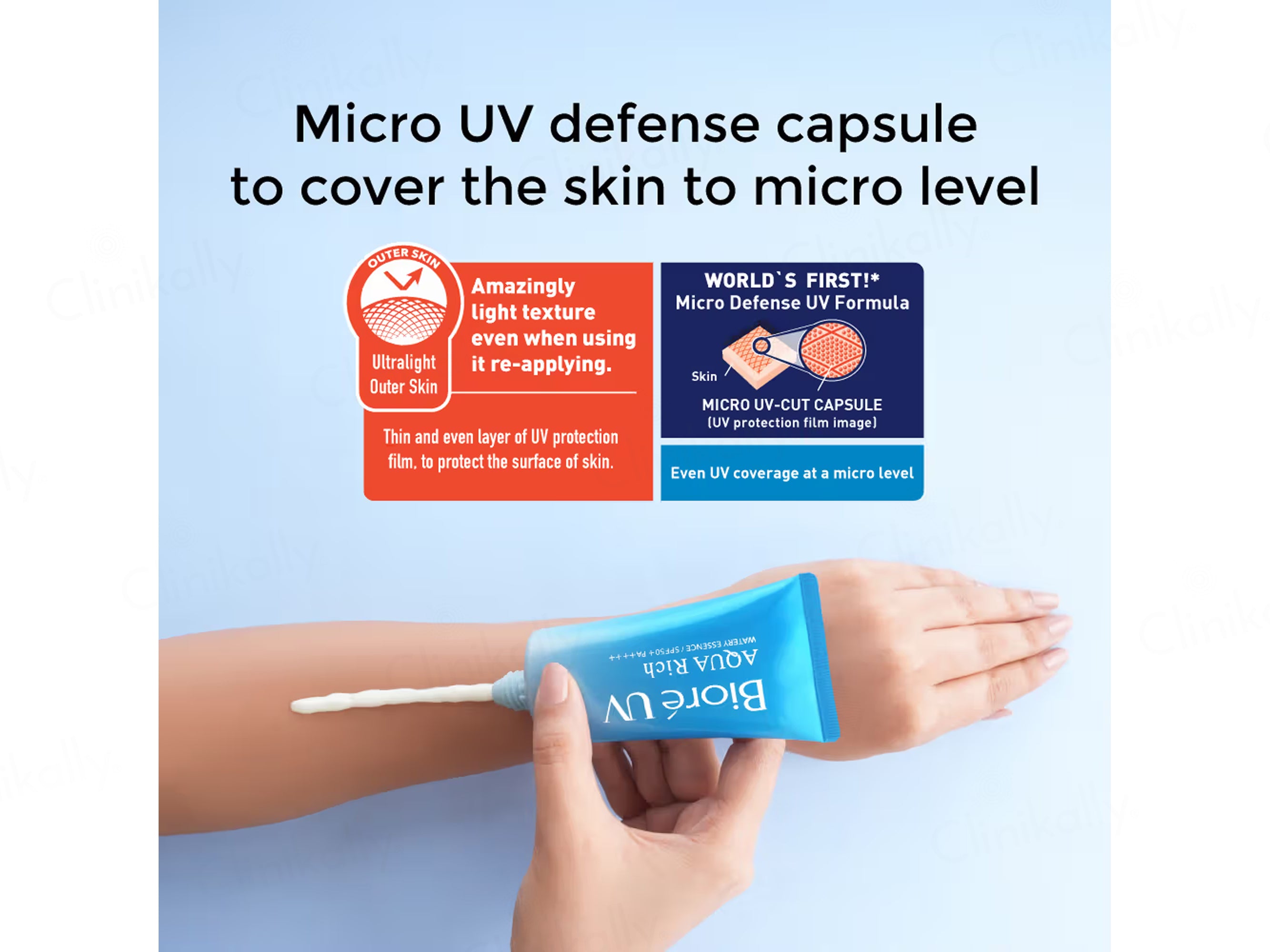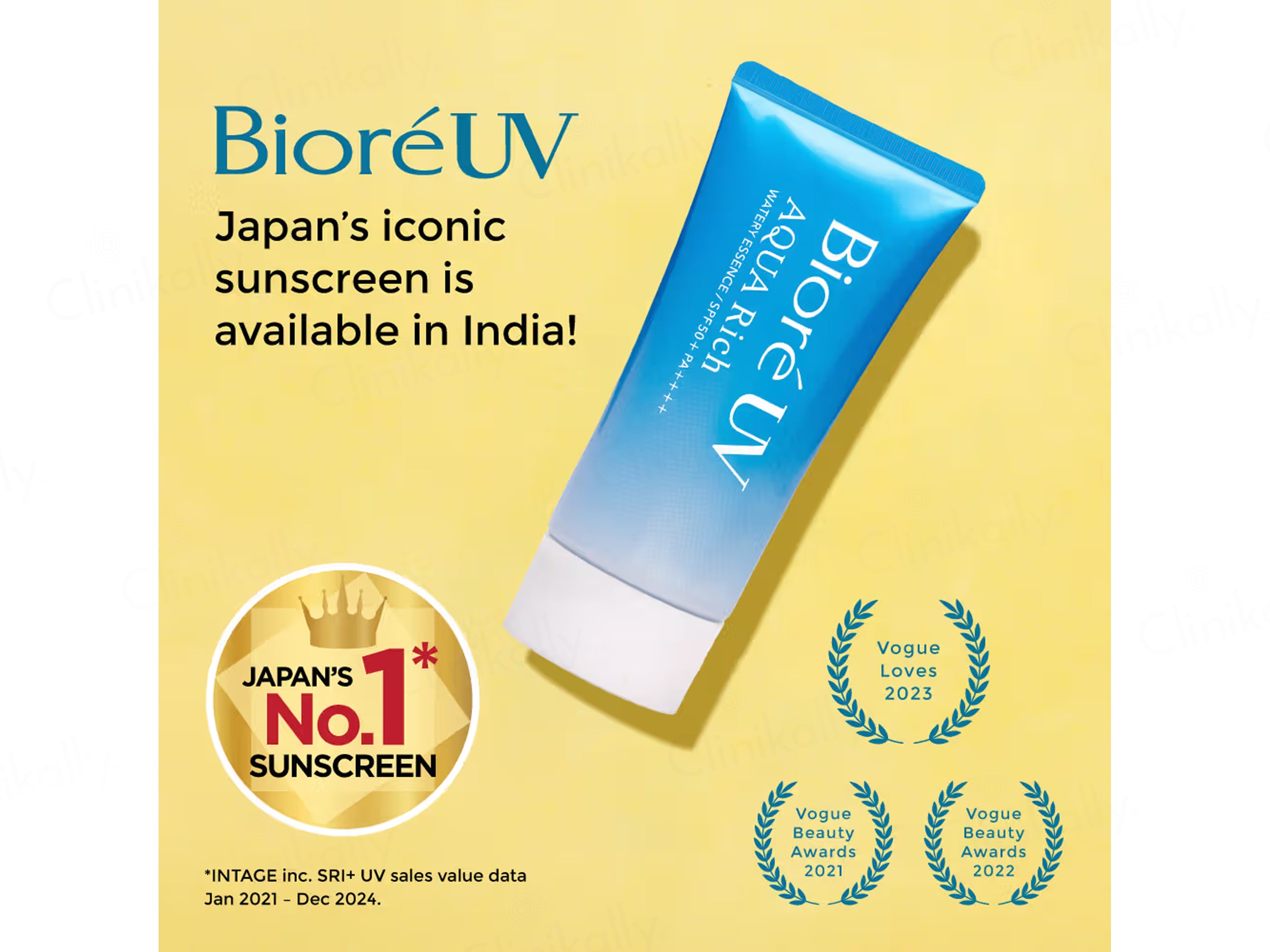 Biore UV Aqua Rich Watery Essence SPF 50+ PA++++ Ultra Lightweight Sunscreen is a refreshing, hydrating sun protection formula featuring advanced Micro Defense Technology that delivers even UV coverage across the skinโs surface and fine lines. This lightweight watery essence contains Hyaluronic Acid, Royal Jelly Extract, and Butylene Glycol for deep hydration, along with Tocopherol (Vitamin E) for antioxidant protection. Its Aqua Micro Capsule releases moisture upon contact, leaving the skin soft, smooth, and non-greasy with a bright, luminous finish. The sunscreen also includes broad-spectrum UV filters like Ethylhexyl Methoxycinnamate, Bis-Ethylhexyloxyphenol Methoxyphenyl Triazine, and Ethylhexyl Triazone, offering SPF 50+ PA++++ protection. Ideal for all skin types, including sensitive skin, it is water- and sweat-resistant for up to 80 minutes, non-comedogenic, and doubles as a smooth makeup primer. Its ultra-light texture absorbs quickly without leaving a white cast or sticky residue, making it perfect for daily wear.