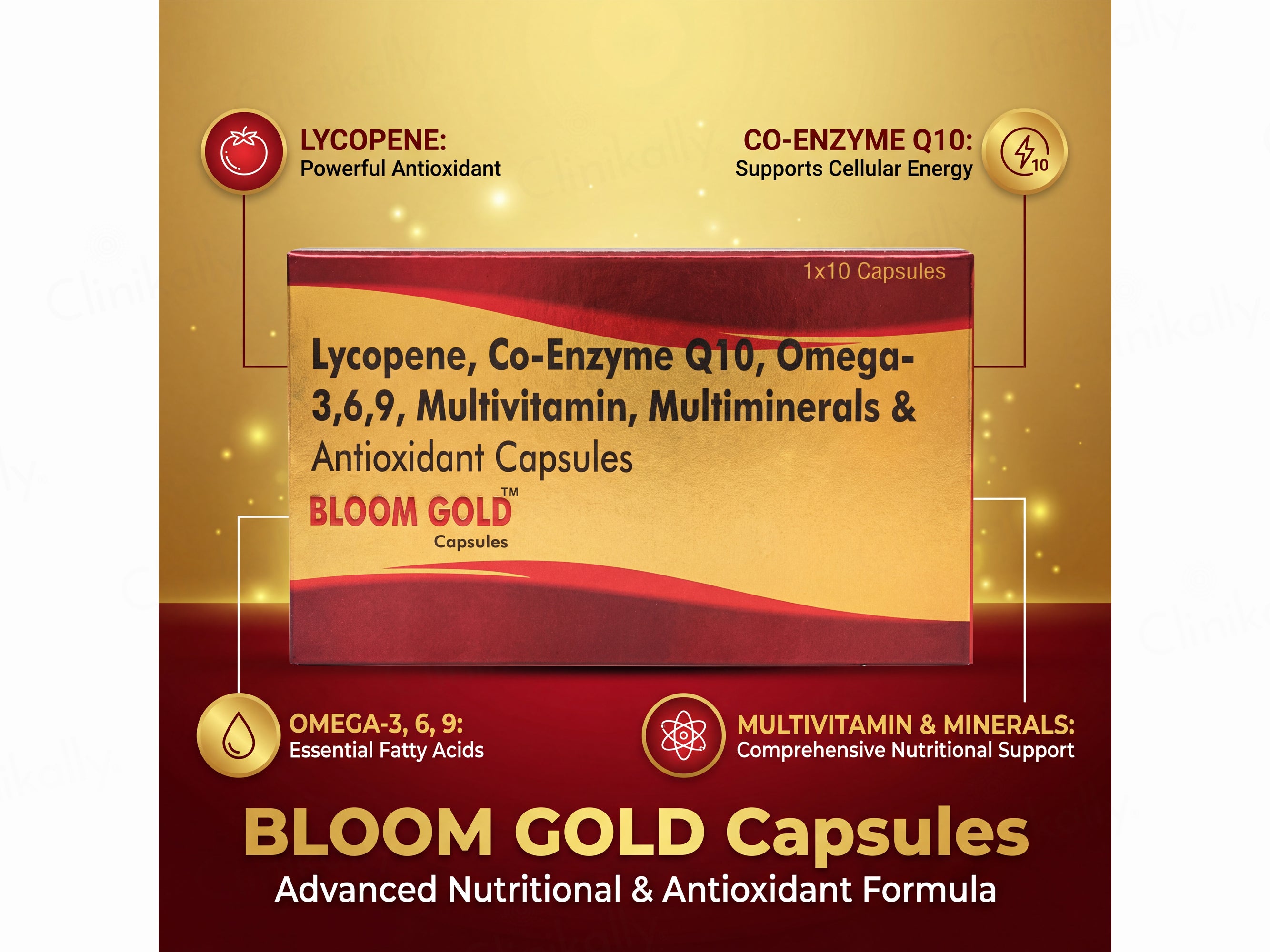 Bloom Gold Antioxidant Capsules are dietary supplements formulated to support overall health and well-being. Each capsule contains a blend of Lycopene, Co-enzyme Q10, Omega 3, 6, 9 fatty acids, along with a comprehensive range of multivitamins and multiminerals. This combination aims to provide antioxidant benefits, support cardiovascular health, and enhance energy levels.