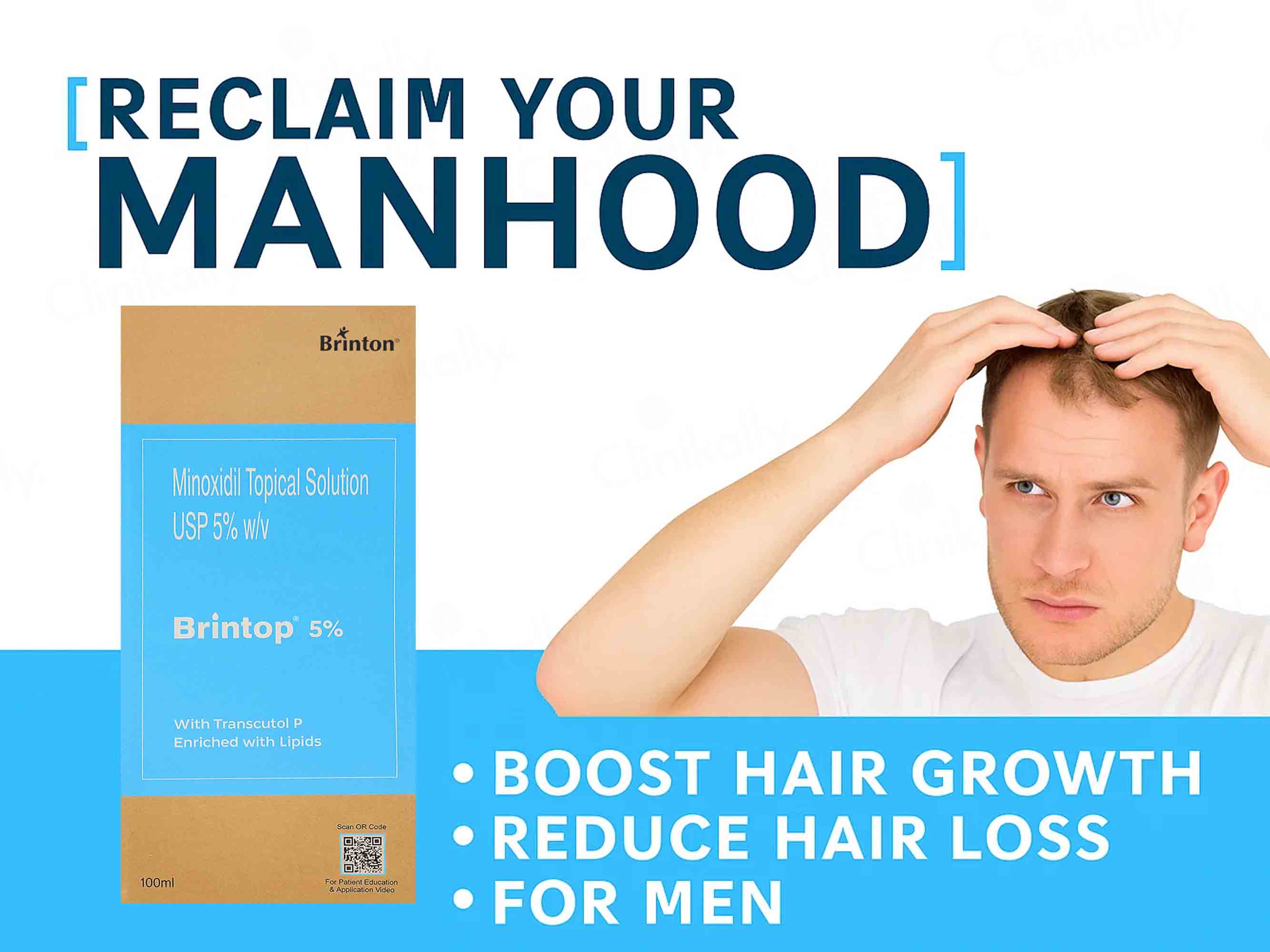 Brintop 5% Topical Solution is a medication containing the active ingredient Minoxidil. It is commonly used to treat hair loss, particularly in cases of male pattern baldness and female pattern hair loss. Applied directly to the scalp, it promotes hair growth by stimulating hair follicles and improving blood flow. It is available as an over-the-counter treatment for hair regrowth.