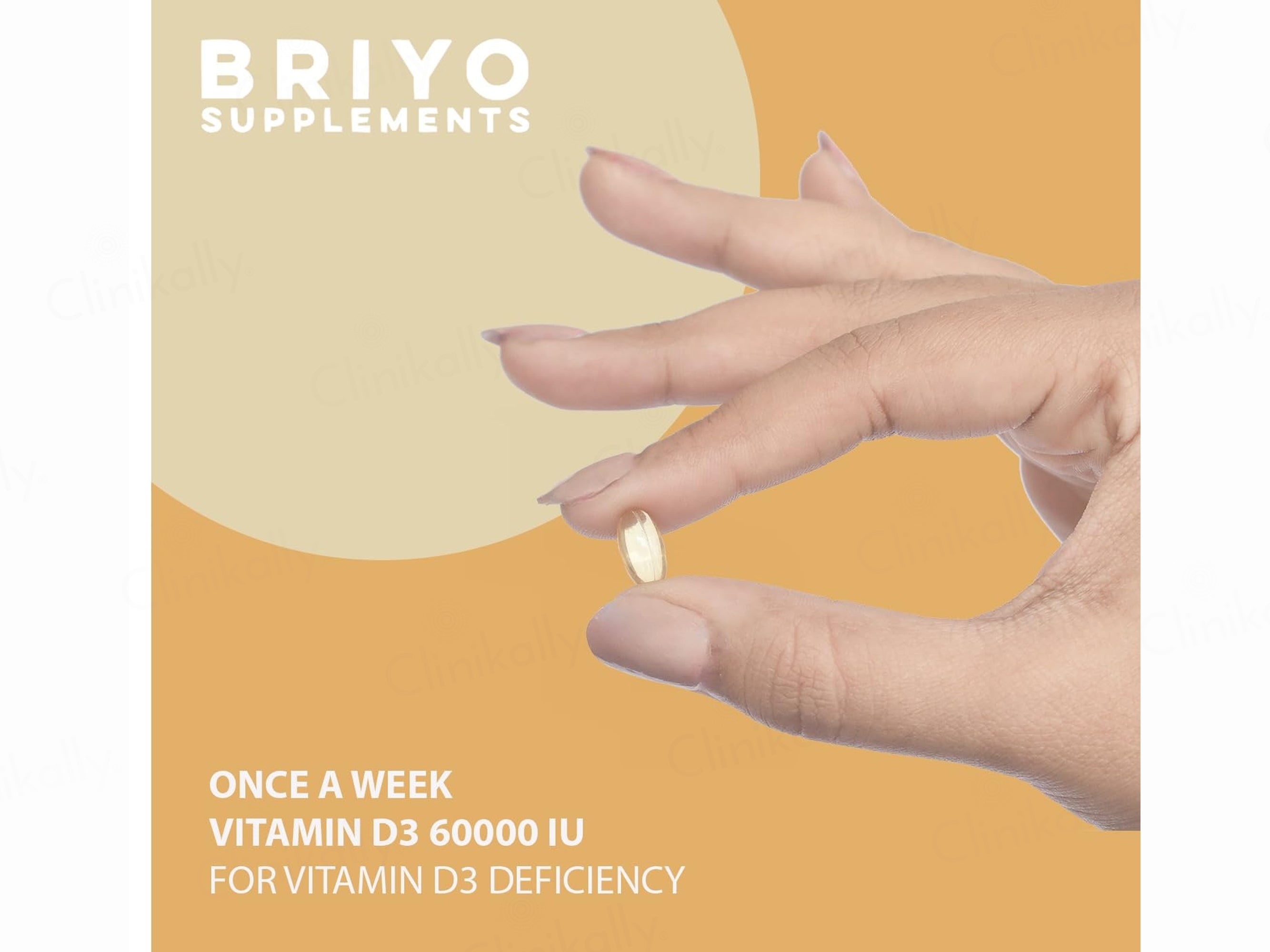 Briyo Briyocal D3 60000 IU Cholecalciferol Softgel Capsule is a high-dose vitamin D3 supplement used to treat and prevent vitamin D deficiency and support bone health.