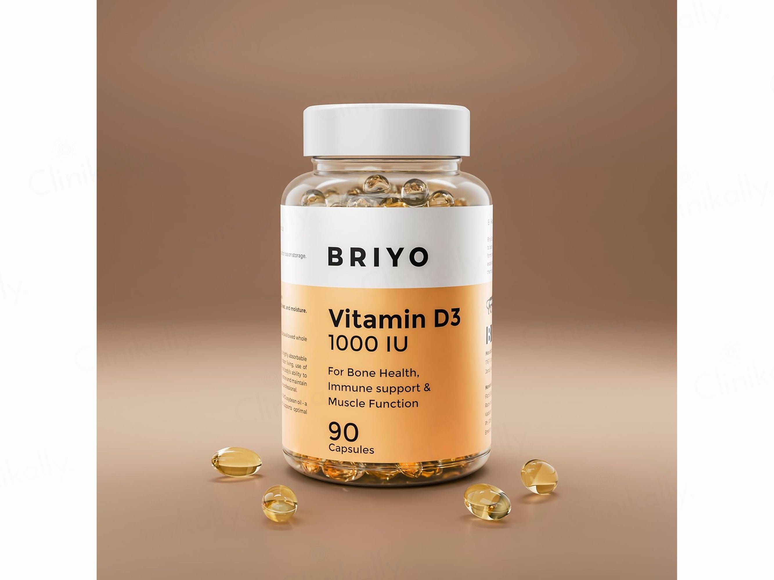 Briyo Vitamin D3 1000 IU Dietary Supplement Capsule is a daily wellness supplement formulated to support bone strength, immune health, and muscle function through a biologically active form of vitamin D as indicated on the pack. The formulation features Vitamin D3 in the form of Cholecalciferol, which plays an essential role in supporting calcium absorption, maintaining healthy bones and teeth, aiding normal muscle function, and contributing to a well-functioning immune system. Designed for regular daily supplementation, Briyo Vitamin D3 1000 IU Dietary Supplement Capsule is suitable for individuals looking to maintain optimal vitamin D levels and overall wellness as part of a balanced and healthy lifestyle.