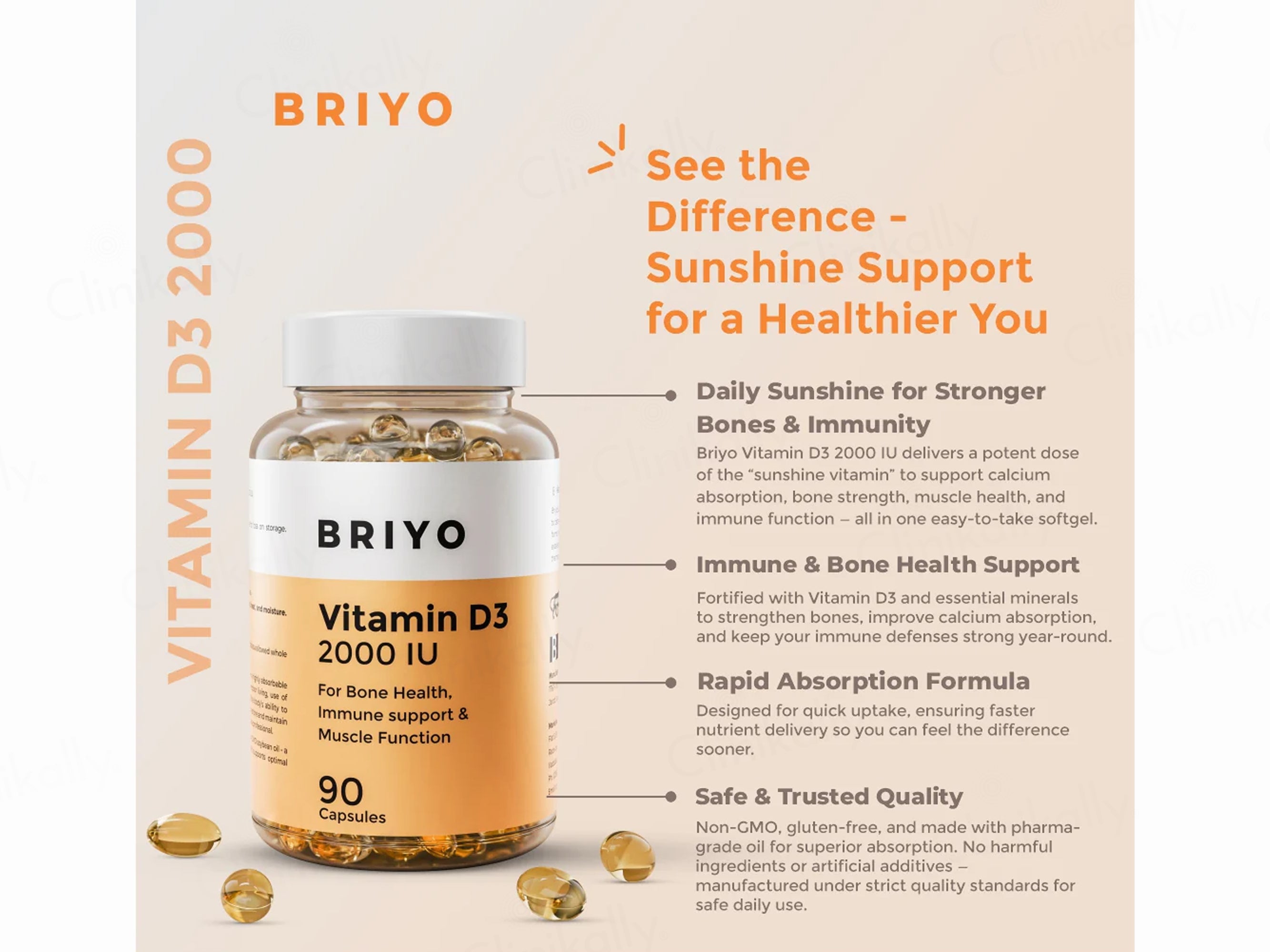 Briyo Vitamin D3 2000 IU Dietary Supplement Capsule is a daily wellness supplement formulated to support bone strength, immune health, and muscle function through a biologically active and easily absorbable form of vitamin D, as indicated on the pack. The formulation contains Vitamin D3 in the form of Cholecalciferol, which plays a vital role in enhancing calcium absorption, maintaining healthy bones and teeth, supporting normal muscle function, and contributing to effective immune system performance. Designed for regular daily use, Briyo Vitamin D3 2000 IU Dietary Supplement Capsule is suitable for individuals seeking reliable vitamin D support to help maintain overall health and wellness as part of a balanced lifestyle.