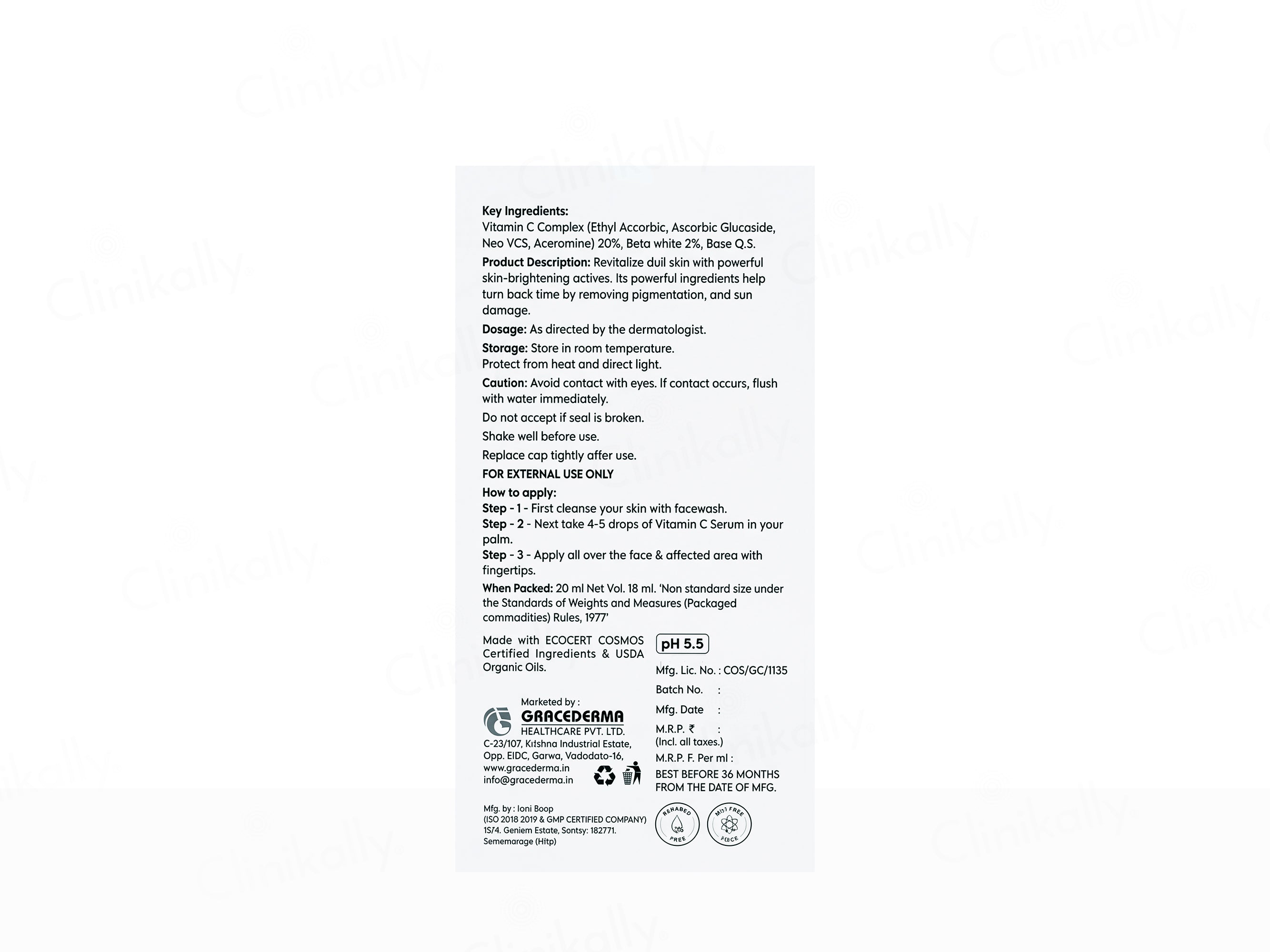 C-Shine Glow Enhancing Face Serum contains Vitamin C Complex (Ethyl Ascorbic, Ascorbic Glucoside, Nio VCS, Aceromine) at 20%, Beta White at 2%, and Base Q.S.