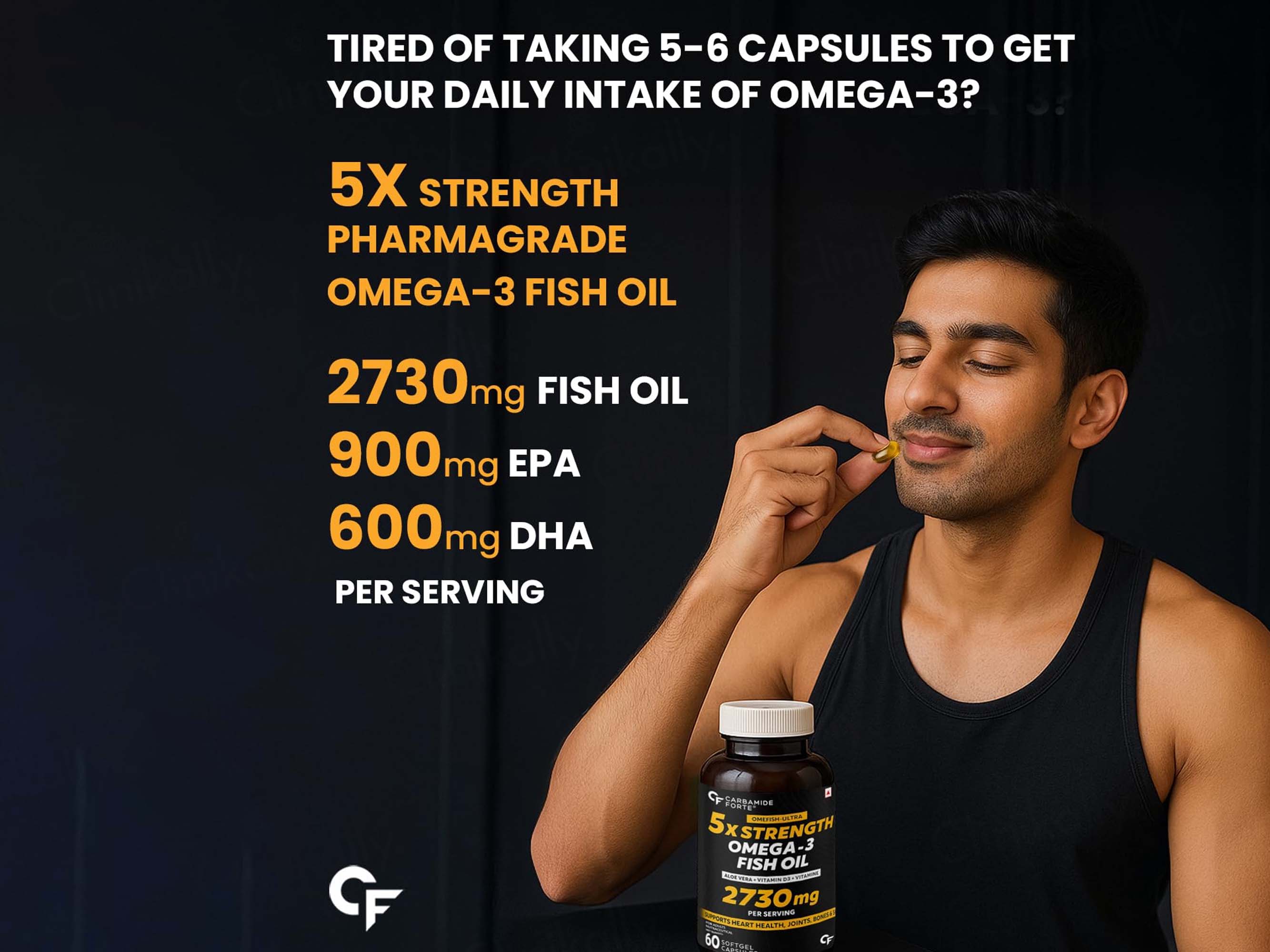 Carbamide Forte 5x Strength Omega-3 Fish Oil Nutraceutical Softgel Capsule is a dietary supplement designed to support heart, brain, and joint health with a high-potency formula suitable for daily use by men and women. Enriched with 2730 mg of fish oil, including 1590 mg Omega-3 (900 mg EPA and 600 mg DHA), Vitamin D3, A, and E, and Aloe Vera, it promotes immunity, improves skin and vision, and offers a burp-free lemon flavor, delivering visible results with consistent use. The molecularly distilled, mercury-free softgels are ideal for enhancing overall wellness as directed.