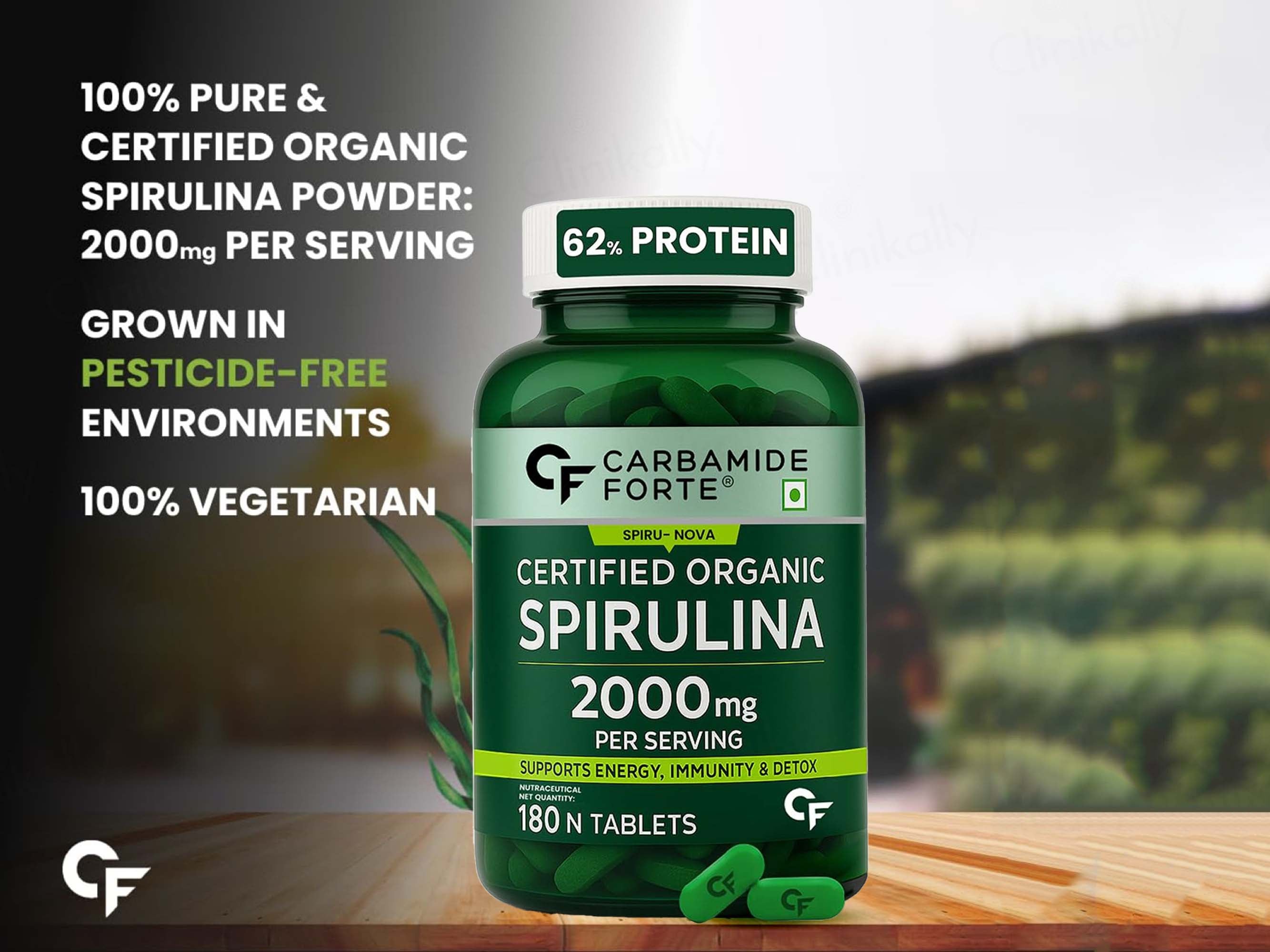 Carbamide Forte Organic Spirulina 2000mg Tablet is generally safe with minimal side effects. However, some individuals may experience mild digestive discomfort. If you have any allergies or specific health conditions, consult a healthcare professional before use.