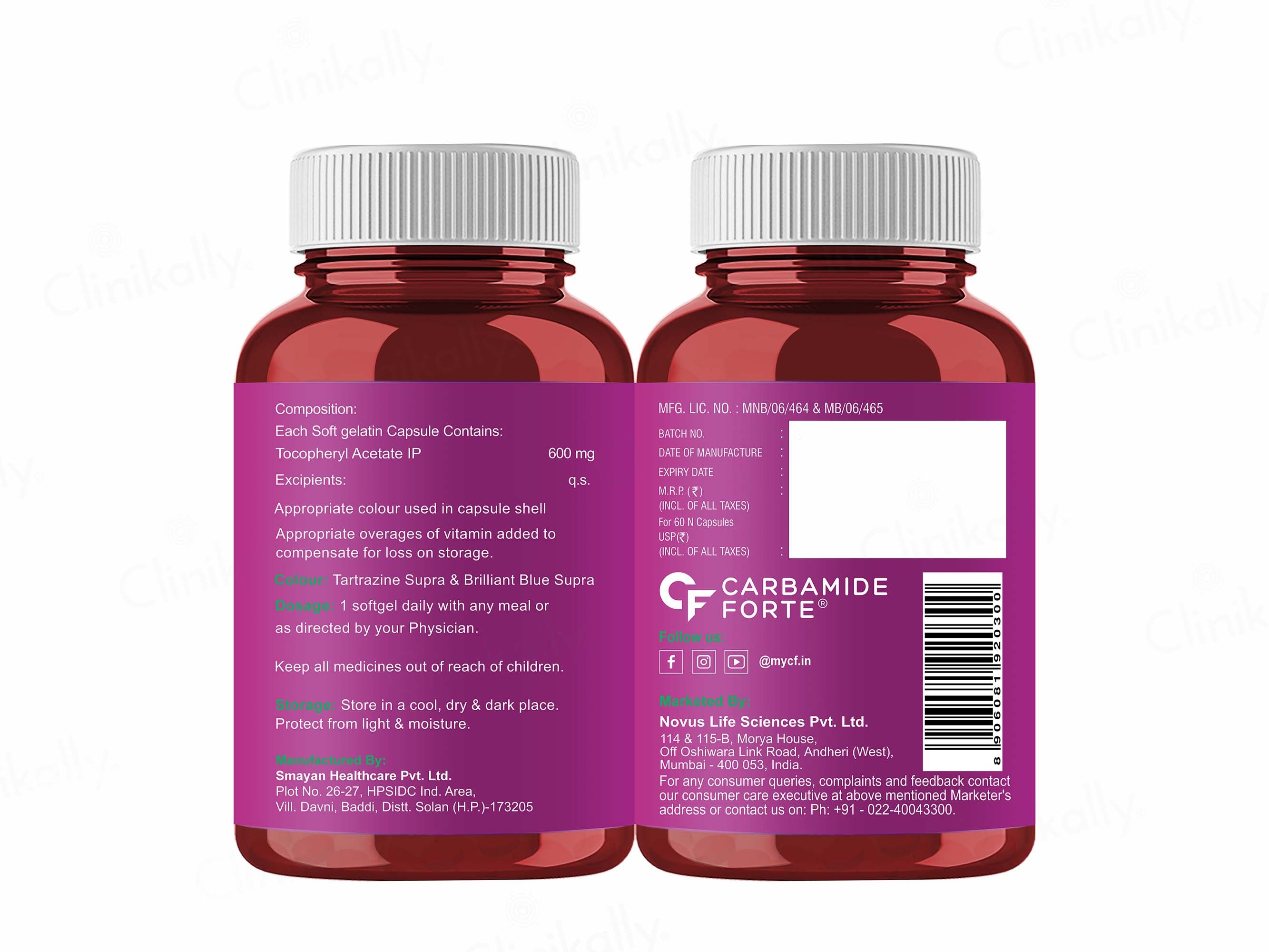 Carbamide Forte Vitamin E 600mg Capsule is a potent antioxidant supplement designed to support overall skin health, boost the immune system, and protect cells from oxidative stress. Ideal for promoting healthy skin and hair, these capsules enhance moisture retention, improve skin elasticity, and contribute to a vibrant complexion. Suitable for men and women, it's an essential nutrient for maintaining optimal health and vitality.