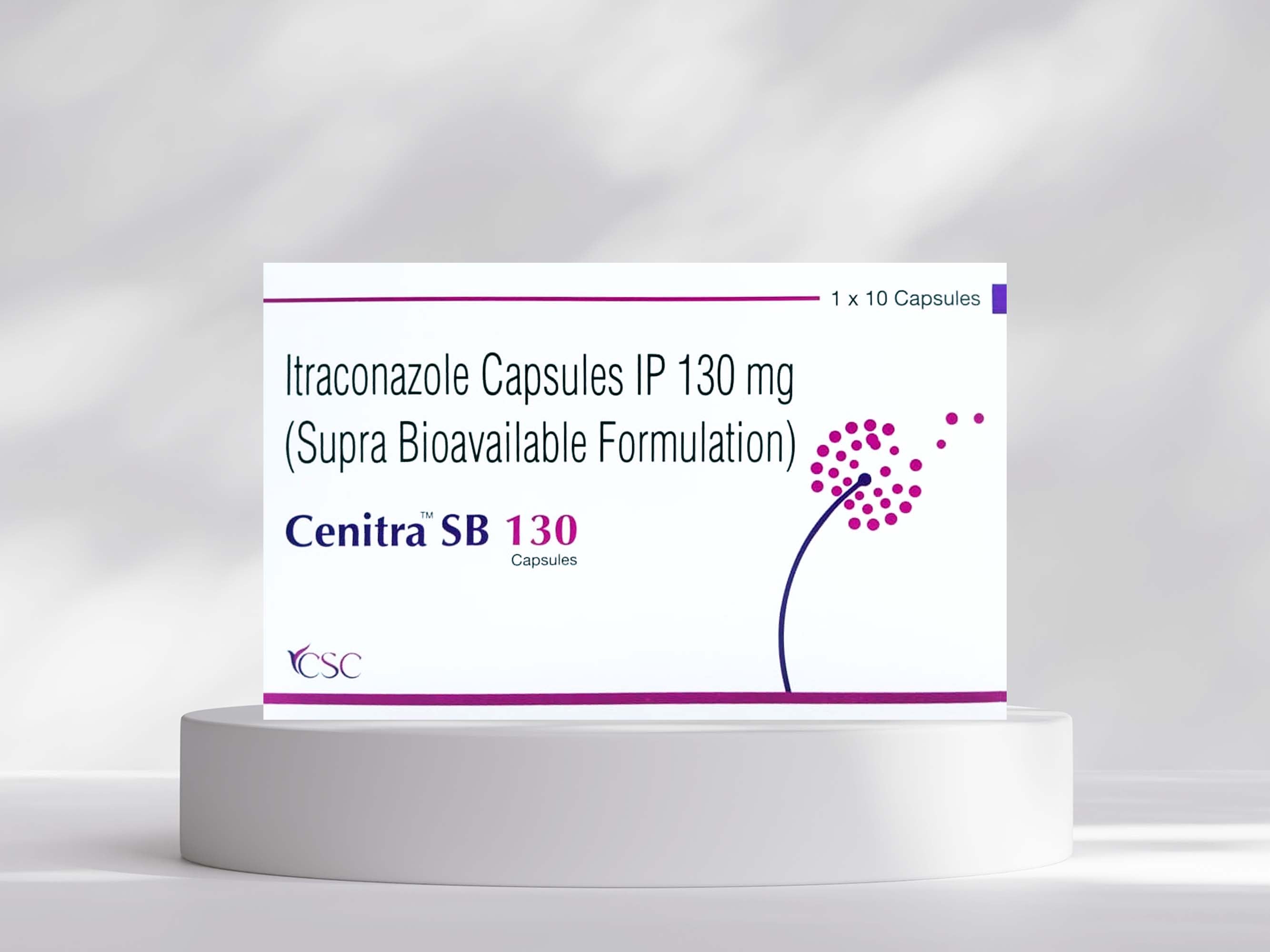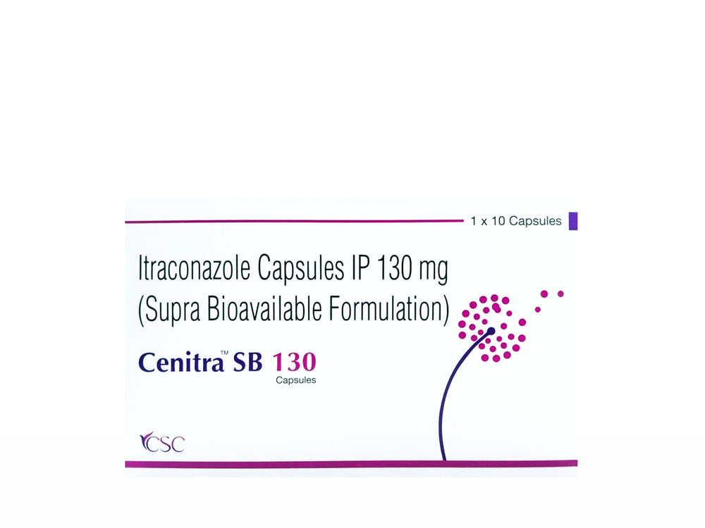 Cenitra SB 130 Capsule is a potent antifungal treatment containing 130mg of supra bioavailable Itraconazole. This formulation enhances the absorption and efficacy of the drug, making it effective against a range of fungal infections. It is commonly prescribed for the treatment of systemic and superficial fungal infections, providing rapid relief with improved bioavailability for better results.