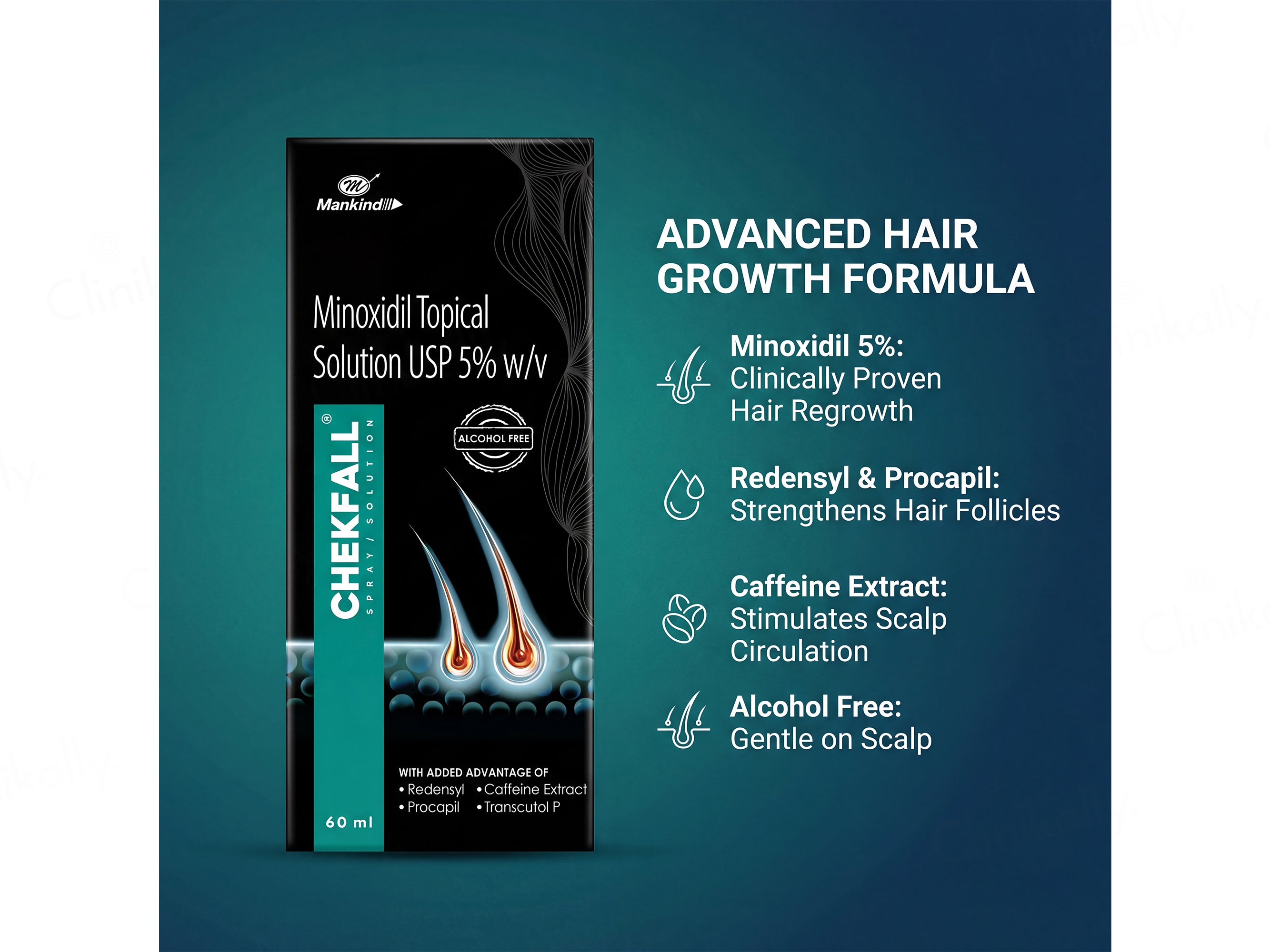 Chekfall 5 Solution is a medication containing the active ingredient Minoxidil. It is commonly used to treat hair loss, particularly in cases of male pattern baldness and female pattern hair loss. This easy-to-apply solution revitalizes hair follicles, increasing hair density and thickness. It's a reliable choice for regaining a fuller, more youthful head of hair and boosting self-confidence.