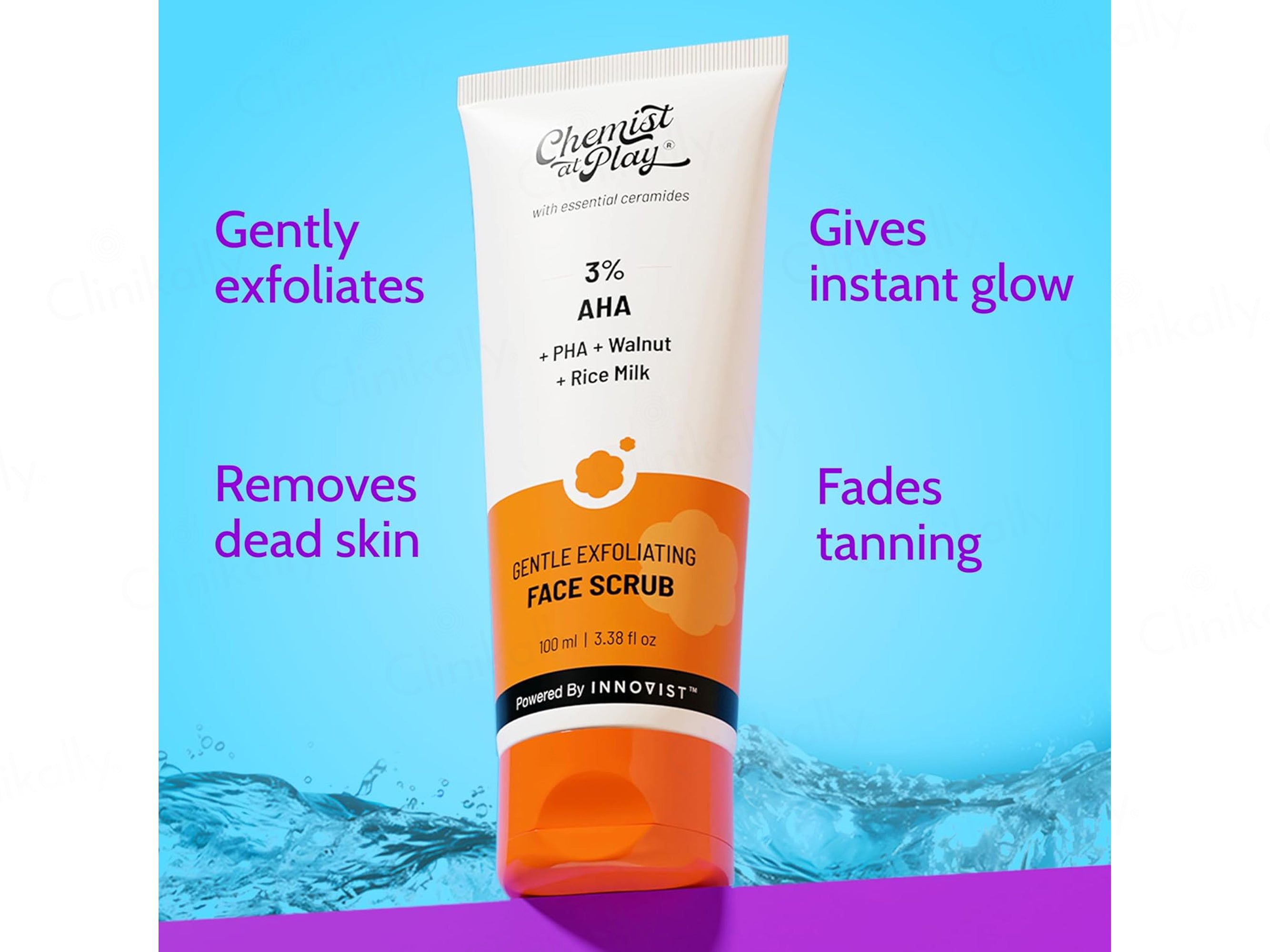 - Apply Chemist At Play 3% AHA Gentle Exfoliating Face Scrub on damp skin, massage gently in circular motions for 20–30 seconds, and rinse thoroughly; use 2–3 times a week for best results.