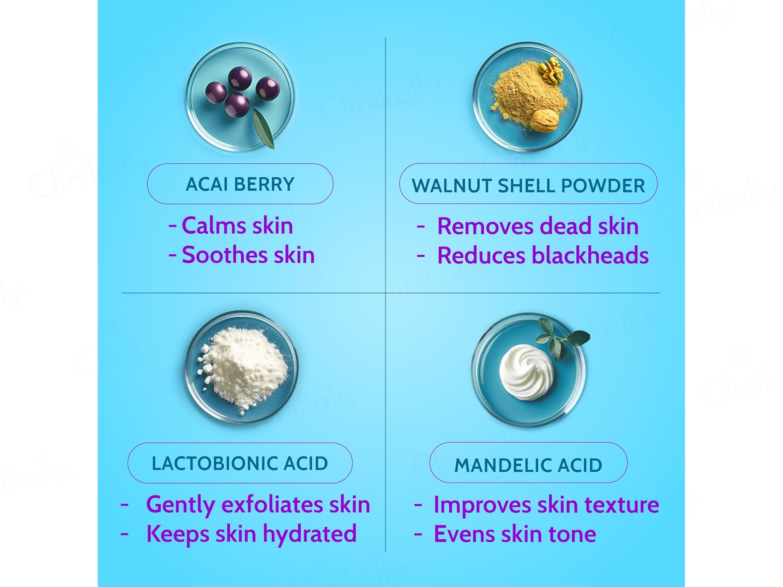 Chemist At Play 3% AHA Gentle Exfoliating Face Scrub is a dual-action exfoliator crafted to refine texture, unclog pores, and brighten dull skin through its balanced blend of chemical and physical exfoliants, featuring key actives like Lactobionic Acid and Mandelic Acid for gentle chemical resurfacing, paired with Walnut Shell Powder and Acai Berry Powder for mild physical buffing; enriched with Oryza Sativa (Rice) Phytoceramide, Konjac Phytoceramide, Shea Butter, Rice Extract, Pink Lemon Fruit Extract, and Sphingolipids to nourish, soften, and support the skin barrier while maintaining hydration and preventing post-exfoliation dryness for smoother, glowing, and healthier-looking skin.