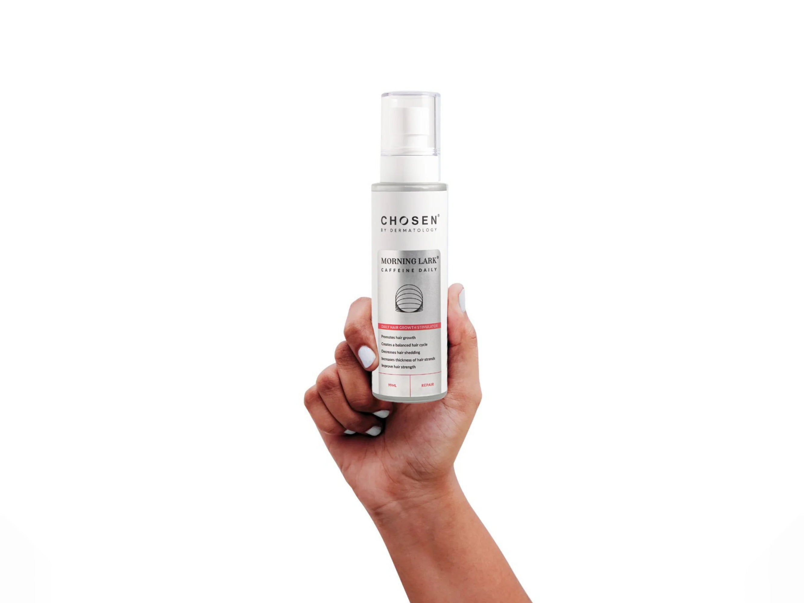 Chosen Morning Lark Caffeine Daily Scalp Solution is a spray to stimulate hair growth and scalp health.
