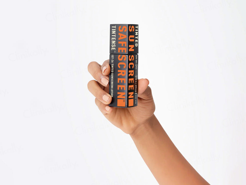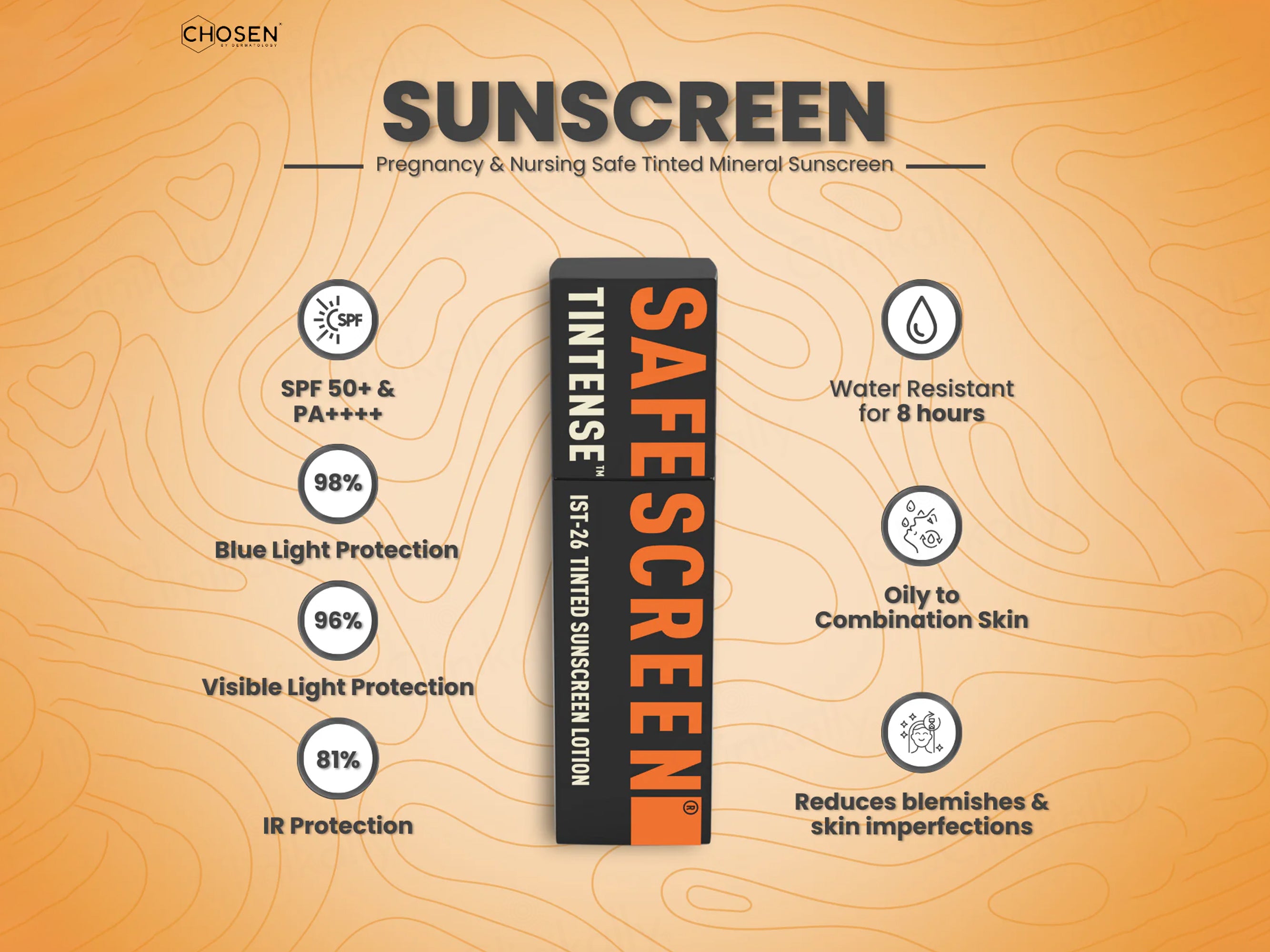 Chosen Safescreen Tintense IST-26 Tinted Sunscreen Lotion SPF 50+ PA++++ is a universal-tinted mineral sunscreen offering high protection and natural coverage. Formulated with non-nano Zinc Oxide and Titanium Dioxide, it shields against UVA/UVB rays while blending seamlessly into most skin tones. The IST-26 adaptive tint neutralizes redness and evens skin tone, perfect for daily wear. Enriched with Hyaluronic Acid, Niacinamide, and Green Tea, it hydrates and soothes sensitive skin. Reef-safe, non-comedogenic, and free from parabens or fragrances, itβs ideal for those seeking sun protection with a lightweight, makeup-like finish.