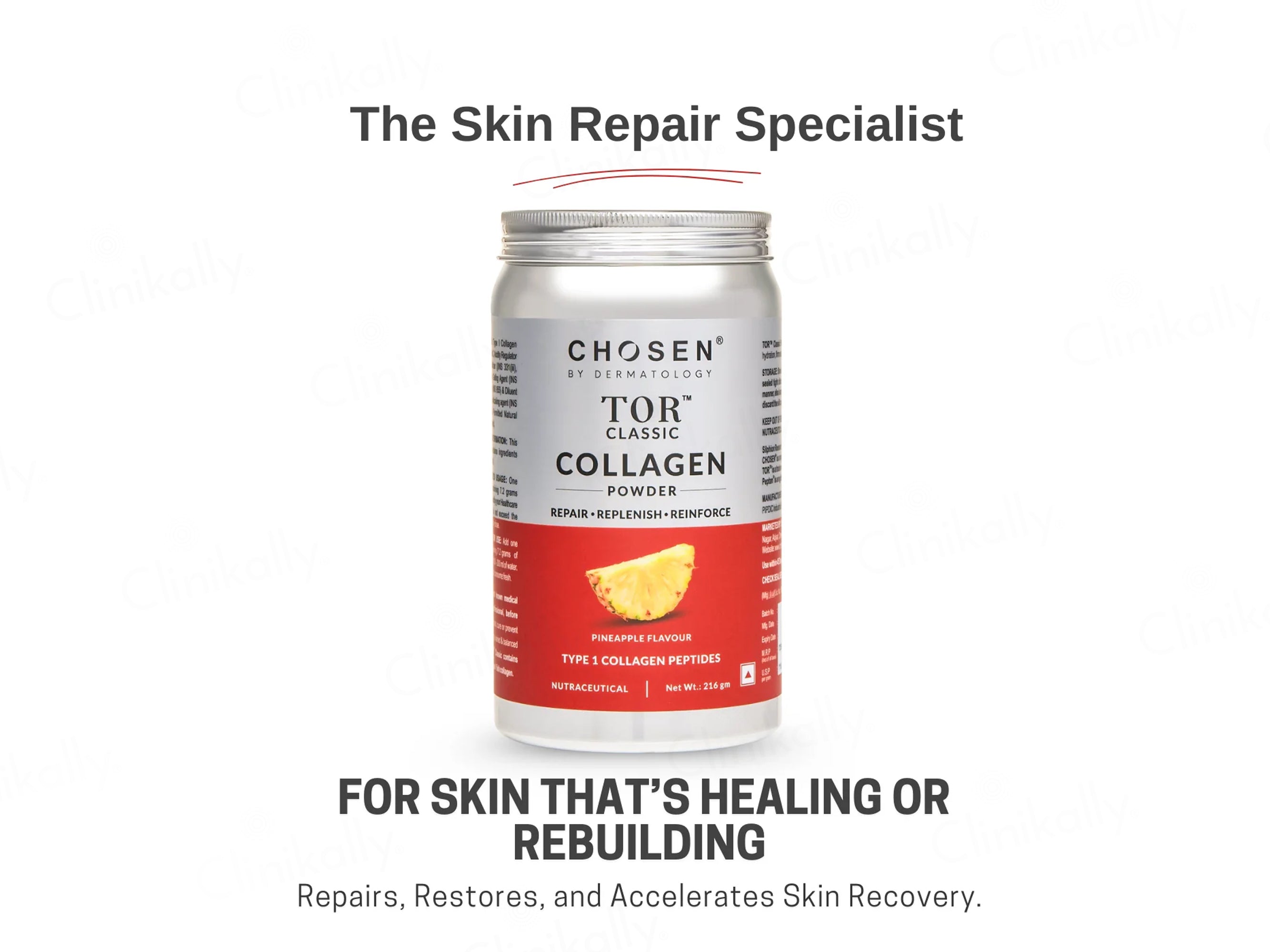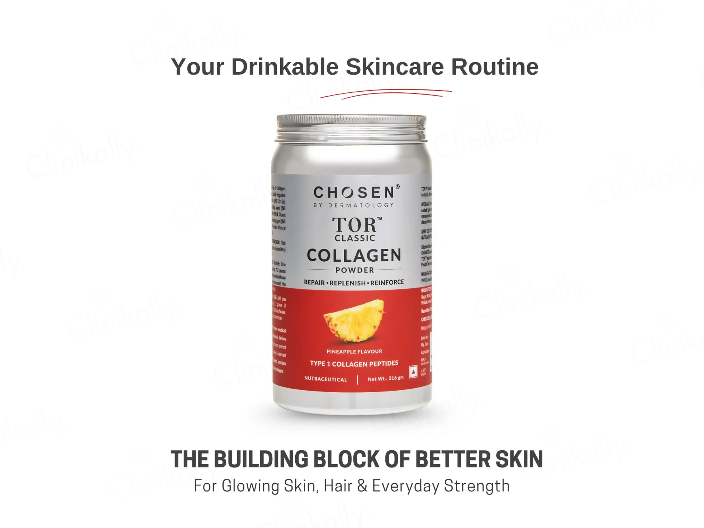 - Mix one scoop of Chosen TOR Classic Regular Marine Collagen Supplement Powder with water or your favorite beverage.