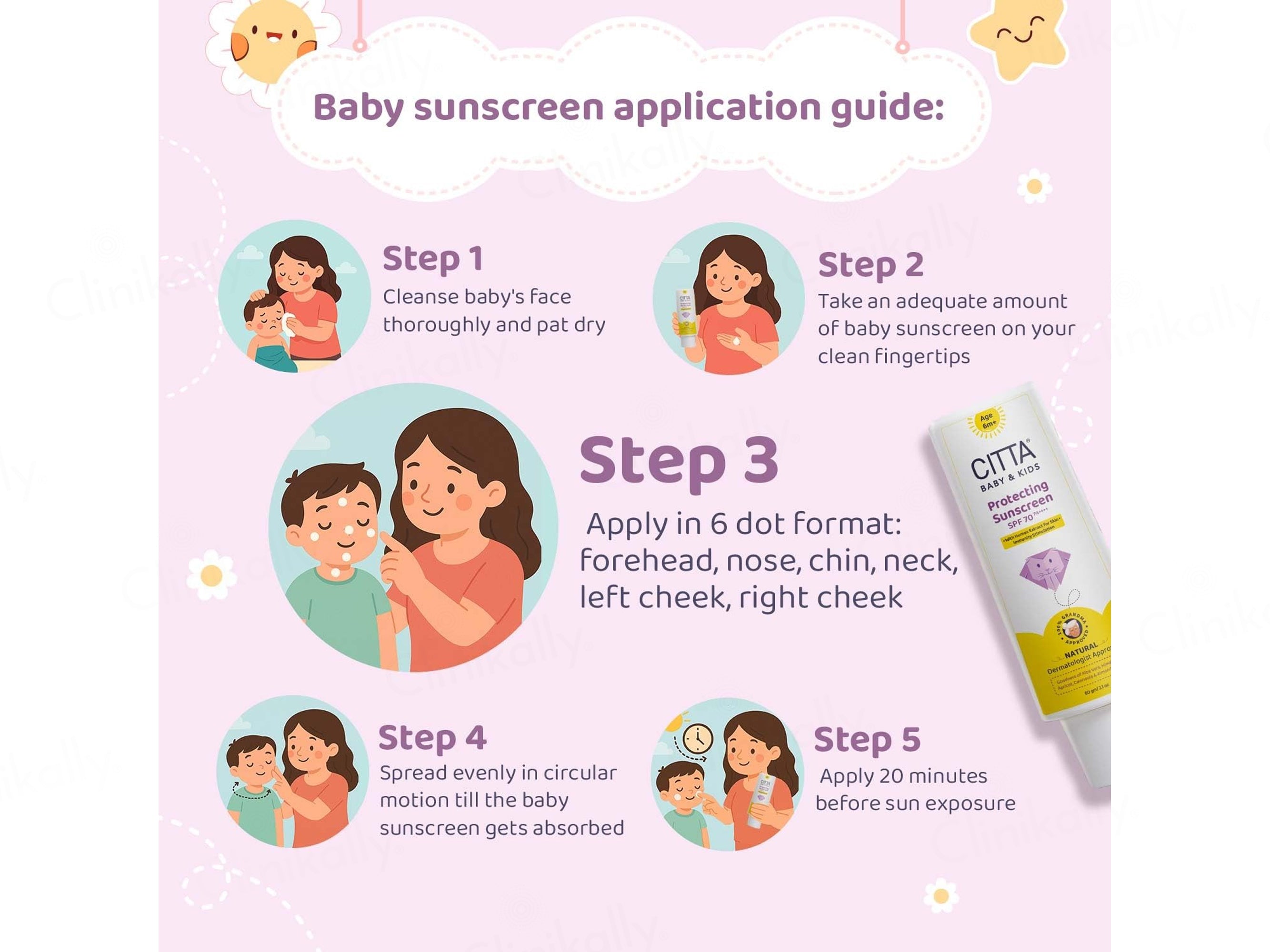 - Apply CITTA Baby & Kids Protecting Sunscreen evenly to cleansed skin before sun exposure.