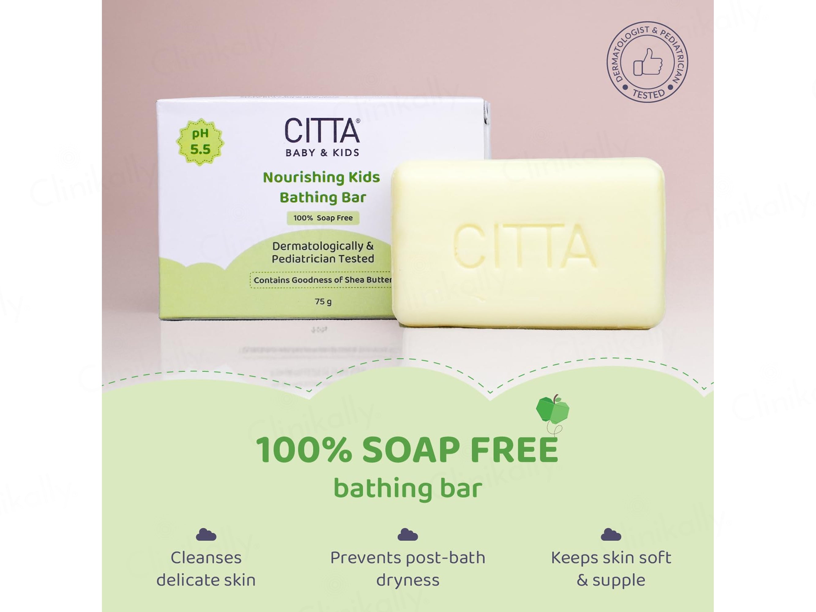CITTA Baby & Kids Nourishing Kids Bathing Bar is a premium, 100% soap-free cleansing solution specifically formulated to cater to the delicate skin of children. Maintaining a skin-friendly pH of 5.5, this bathing bar ensures a gentle yet effective cleanse without stripping away natural oils or causing irritation. It is enriched with the goodness of Shea Butter, which provides deep moisturization and nourishment, leaving the skin soft and healthy. This dermatologically and pediatrician-tested formula utilizes a mild Syndet Base and Coco Glucoside Glyceryl Oleate to create a soothing lather that is safe for sensitive young skin. Designed for daily use, it combines safety with effectiveness, making it an essential part of a child's hygiene routine while protecting their skin's natural barrier. The inclusion of high-quality ingredients like Tinogard TT and Disodium EDTA ensures product stability and purity, providing parents with peace of mind for their little one's skin health.