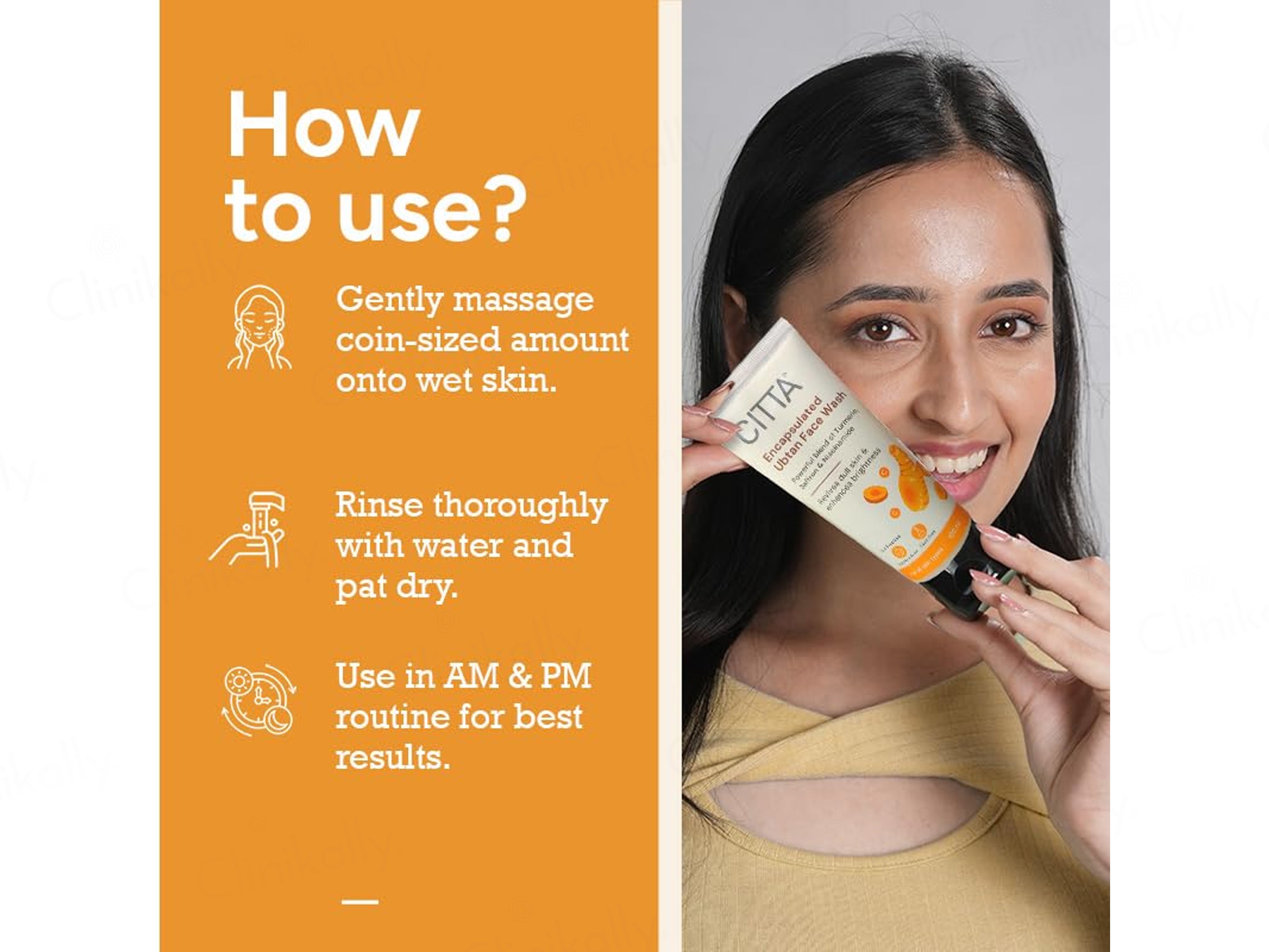 CITTA Encapsulated Ubtan Face Wash is a revitalizing daily cleanser designed to revive dull skin and enhance natural brightness by combining traditional skincare wisdom with modern science. Formulated with a powerful blend of Curcumin (Turmeric) Extract, Crocus Sativus (Saffron) Extract, and Niacinamide, it effectively targets uneven skin tone and pigmentation. The addition of 3-O-Ethyl Ascorbic (Vitamin C) Acid provides potent antioxidant protection and further boosts radiance, while Curcuma Longa (Turmeric) Oil ensures the skin is deeply nourished. This sulphate-free and toxin-free face wash utilizes gentle surfactants like Decyl Glucoside and Cocamidopropyl Betaine to cleanse without irritation. Enriched with Allantoin for its soothing properties and Glycerine for moisture retention, the formula leaves the skin feeling fresh, soft, and supple. Suitable for those looking to reclaim a glowing complexion, it removes impurities while preserving the skin's natural lipid balance. Regular use helps unveil a clearer, more luminous appearance, making it a perfect first step in a brightening skincare routine.