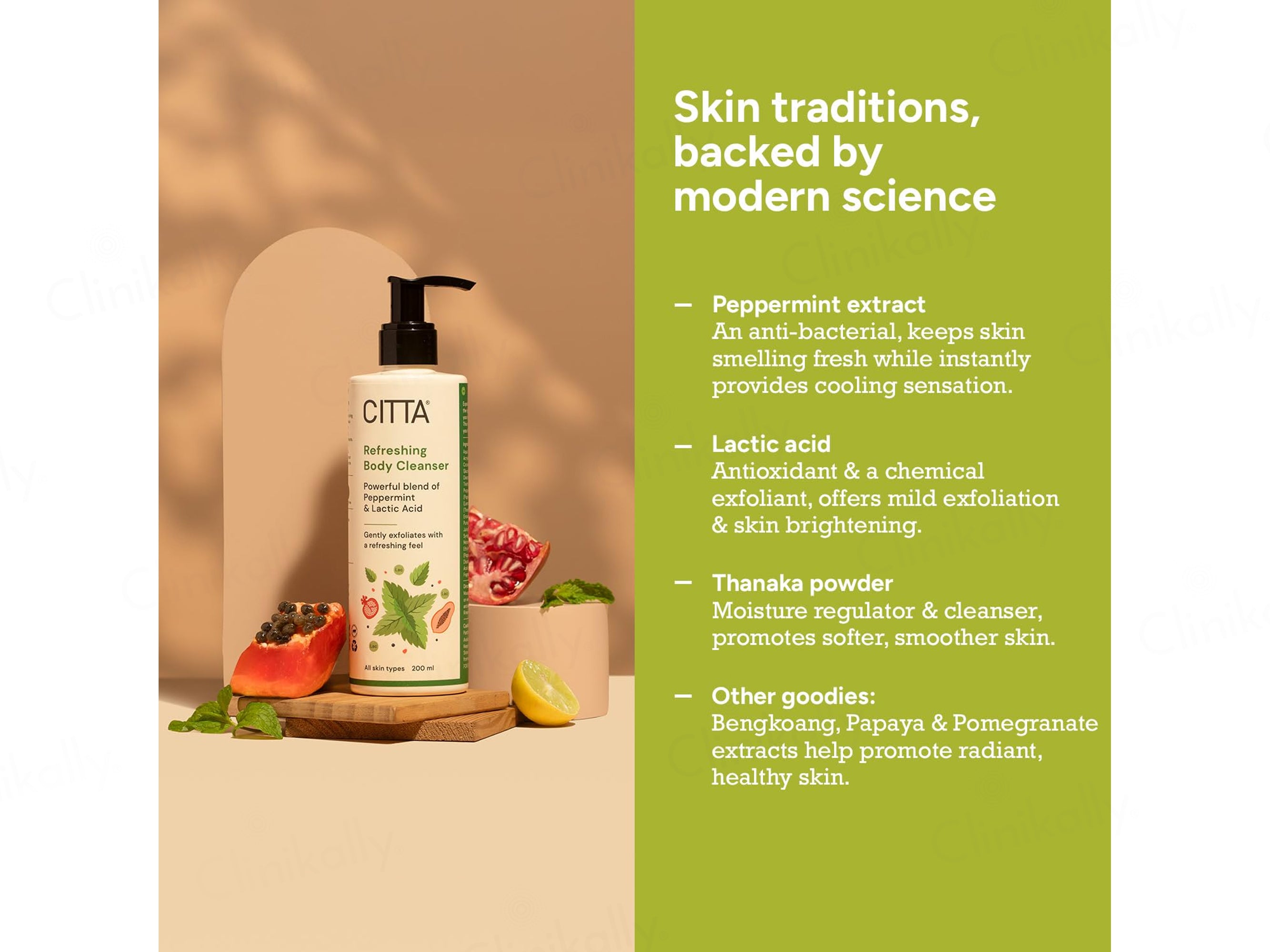 CITTA Refreshing Body Cleanser is an ultra-revitalizing daily wash meticulously crafted to provide a deep, cooling cleanse while gently resurfacing the skin for a more radiant glow. Featuring a powerful blend of Mentha Piperita (Peppermint) Leaf Extract and Lactic Acid, it offers a refreshing sensory experience while chemically exfoliating dead skin cells to reveal smoother, brighter skin underneath. The formula is further enriched with a potent cocktail of natural botanicals, including Carica Papaya (Papaya) Fruit Juice, Citrus Limon (Lemon) Juice, and Punica Granatum (Pomegranate) Fruit Juice, which infuse the skin with antioxidants and natural brightness. Unique traditional ingredients like Limonia Acidissima (Thanaka) Wood Powder and Pachyrhizus Erosus (Bengkoang) Root Extract work to soothe the skin and improve overall tone. This sulfate-balanced cleanser utilizes Sodium Lauryl Sarcosinate and Decyl Glucoside to create a gentle yet effective lather that removes impurities without disrupting the skin's natural moisture balance. Designed to leave you feeling invigorated, this body cleanser transforms your daily shower into a refreshing ritual that promotes soft, healthy, and luminous skin from head to toe.