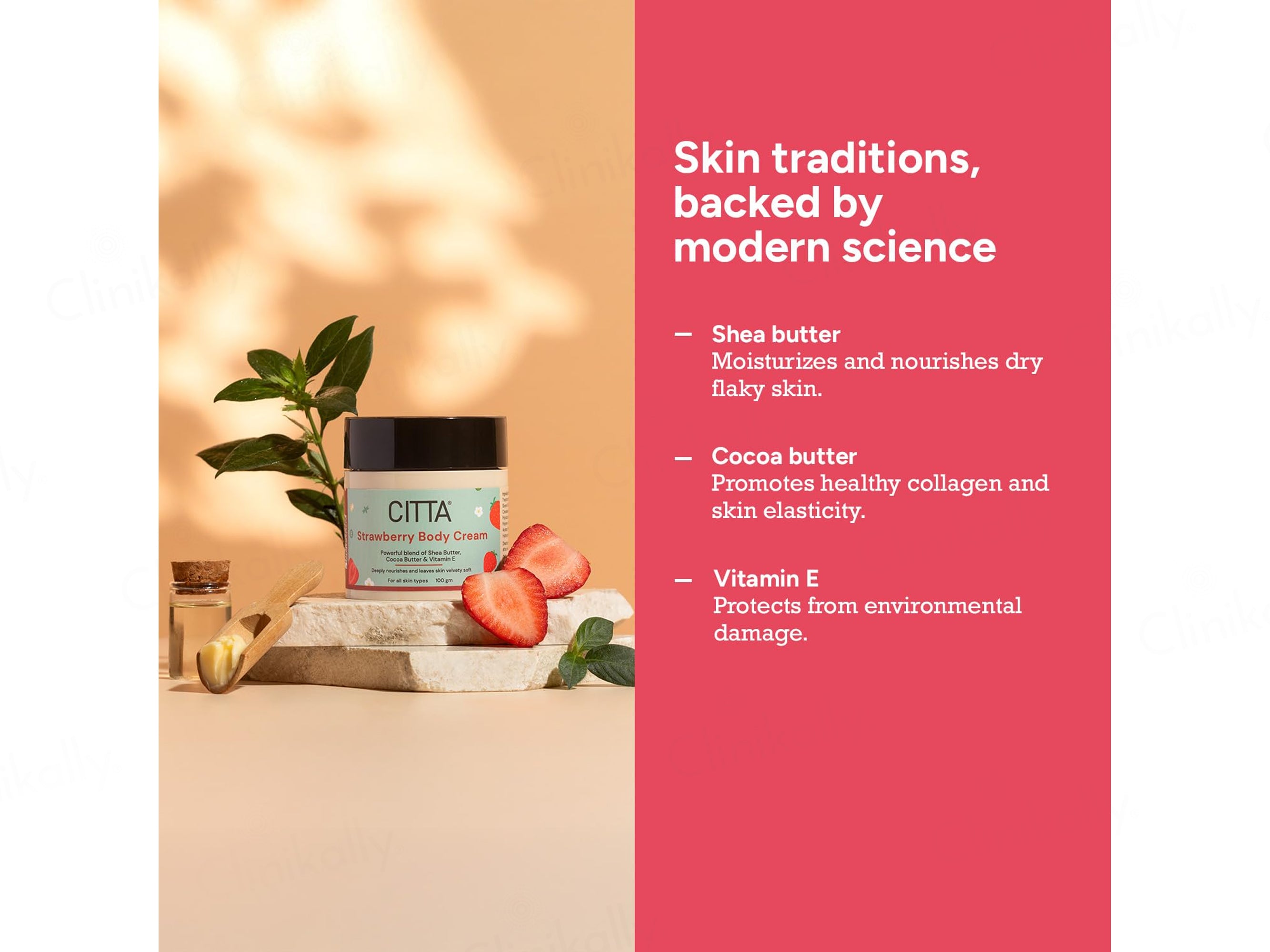 CITTA Strawberry Body Cream is an ultra-rich, decadent moisturizer designed to provide deep nourishment and long-lasting hydration, leaving the skin feeling velvety soft. Formulated with a powerful emollient blend of Shea Butter and Cocoa Seed Butter, it creates a protective moisture barrier that effectively repairs dry and parched skin. The cream is further enriched with Vitamin E Acetate, a potent antioxidant that helps protect the skin from environmental stressors while improving overall skin health. Its smooth, creamy texture is supported by skin-conditioning agents like Glycerine and Capric Caprylic Triglyceride, ensuring an effortless application and deep penetration without a heavy, greasy feel. This body cream is perfect for intense moisturization, locking in hydration to maintain a smooth, supple, and radiant appearance throughout the day. With its delightful fragrance and skin-loving butters, it transforms your daily skincare routine into a luxurious, pampering experience that delivers visible softness and comfort to your body.