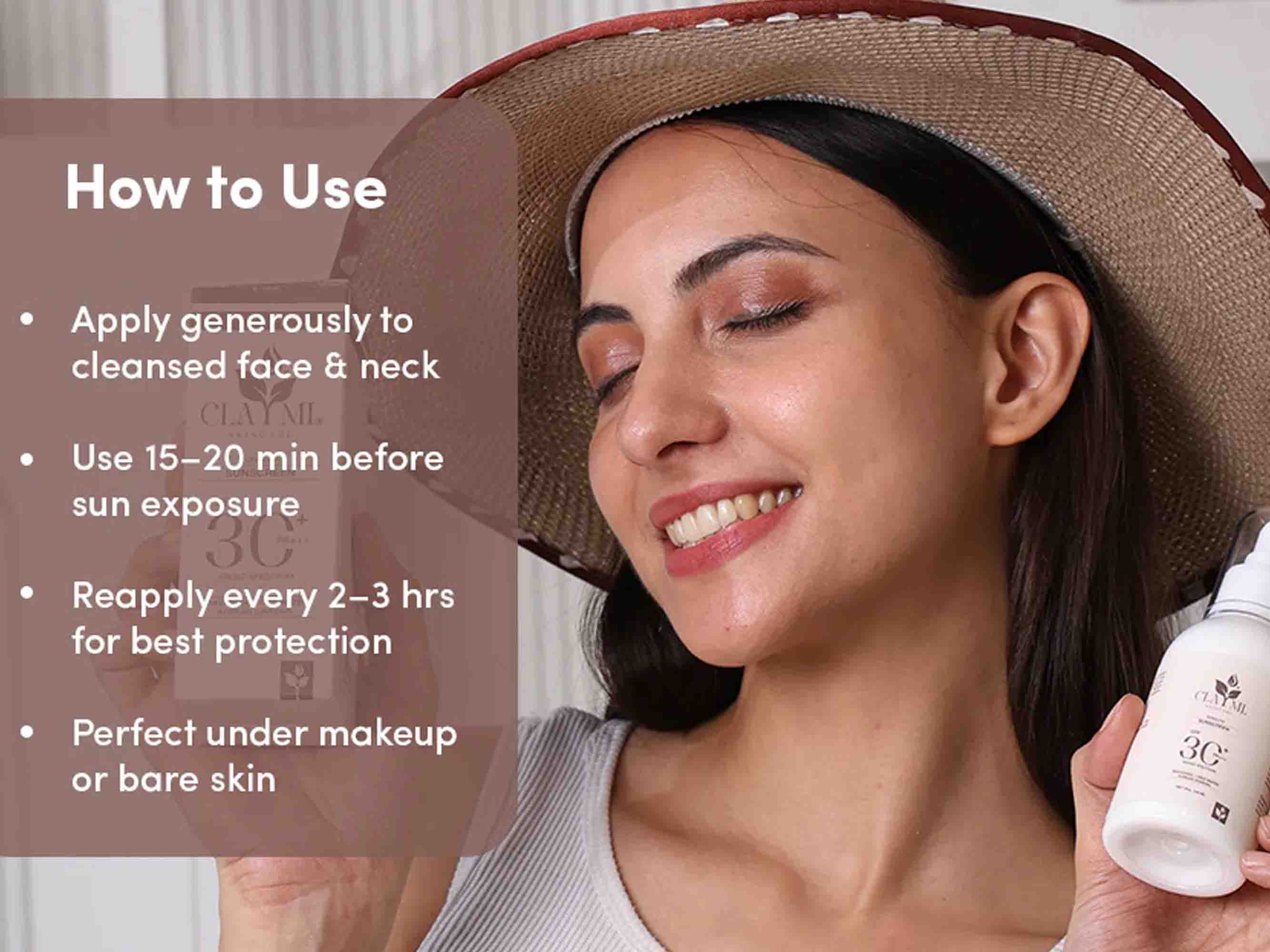Apply Claymi Sunglow Broad Spectrum Sunscreen SPF 30+ PA+++ generously on face and neck 15 minutes before sun exposure, reapplying every 2 hours or after sweating.