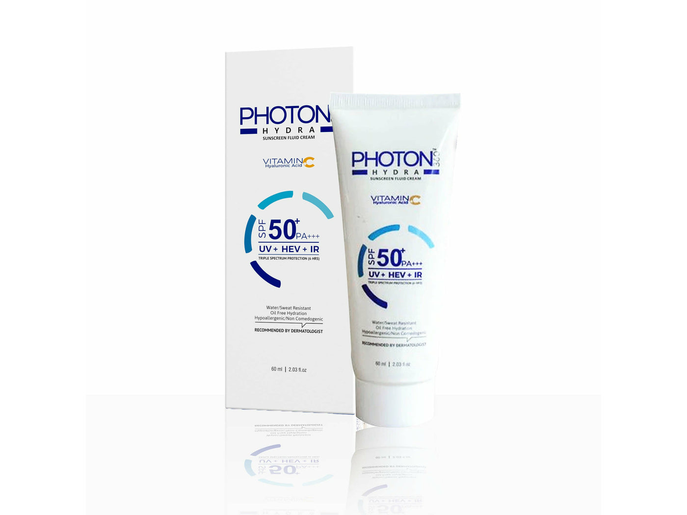 Aclaris Photon 360 Hydra Sunscreen Fluid Cream SPF 50+ (50 ml) offers comprehensive protection against UVA/UVB, High Energy Visible rays, and Infrared rays. Enriched with antioxidants like Vitamin C and Hyaluronic Acid, it provides long-lasting defense with an ultra-soft, oil-free texture.
