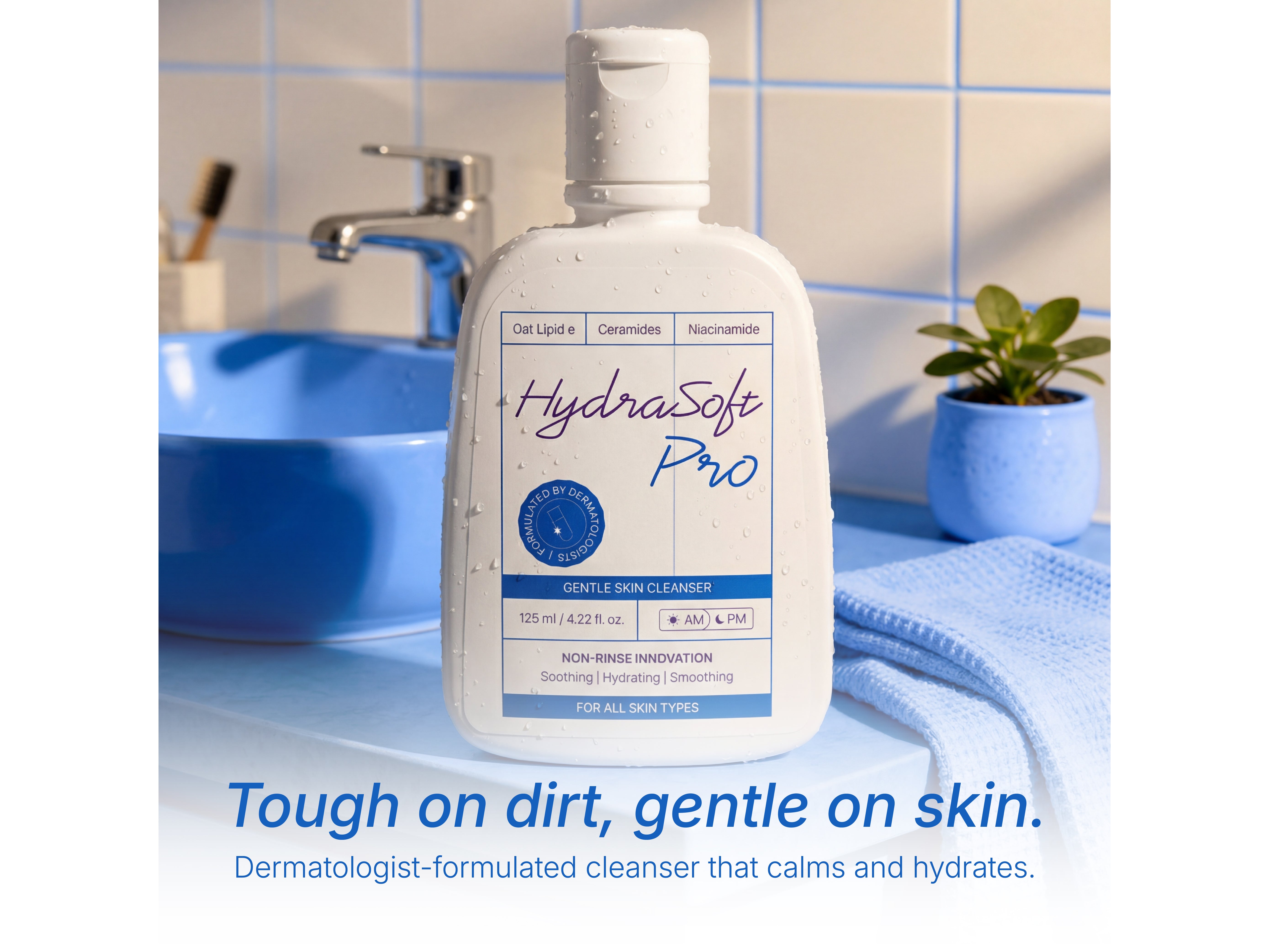 Clinikally HydraSoft Pro Gentle Skin Cleanser is a dermatologist-formulated, non-rinse skin cleanser that gently removes dirt, oil, and makeup without disrupting the skin barrier. Powered by Oat Lipid e, Ceramides and Niacinamide, it calms inflammation, restores hydration, and strengthens skin against dryness or irritation. Its innovative rinse-free formula is especially suited for sensitive, post-procedure, or barrier-impaired skin, leaving it soft, smooth, and soothed after every use. Clinically tested to be hypoallergenic and free from soap, fragrance, parabens, and cruelty. It is ideal for daily use by all skin types.