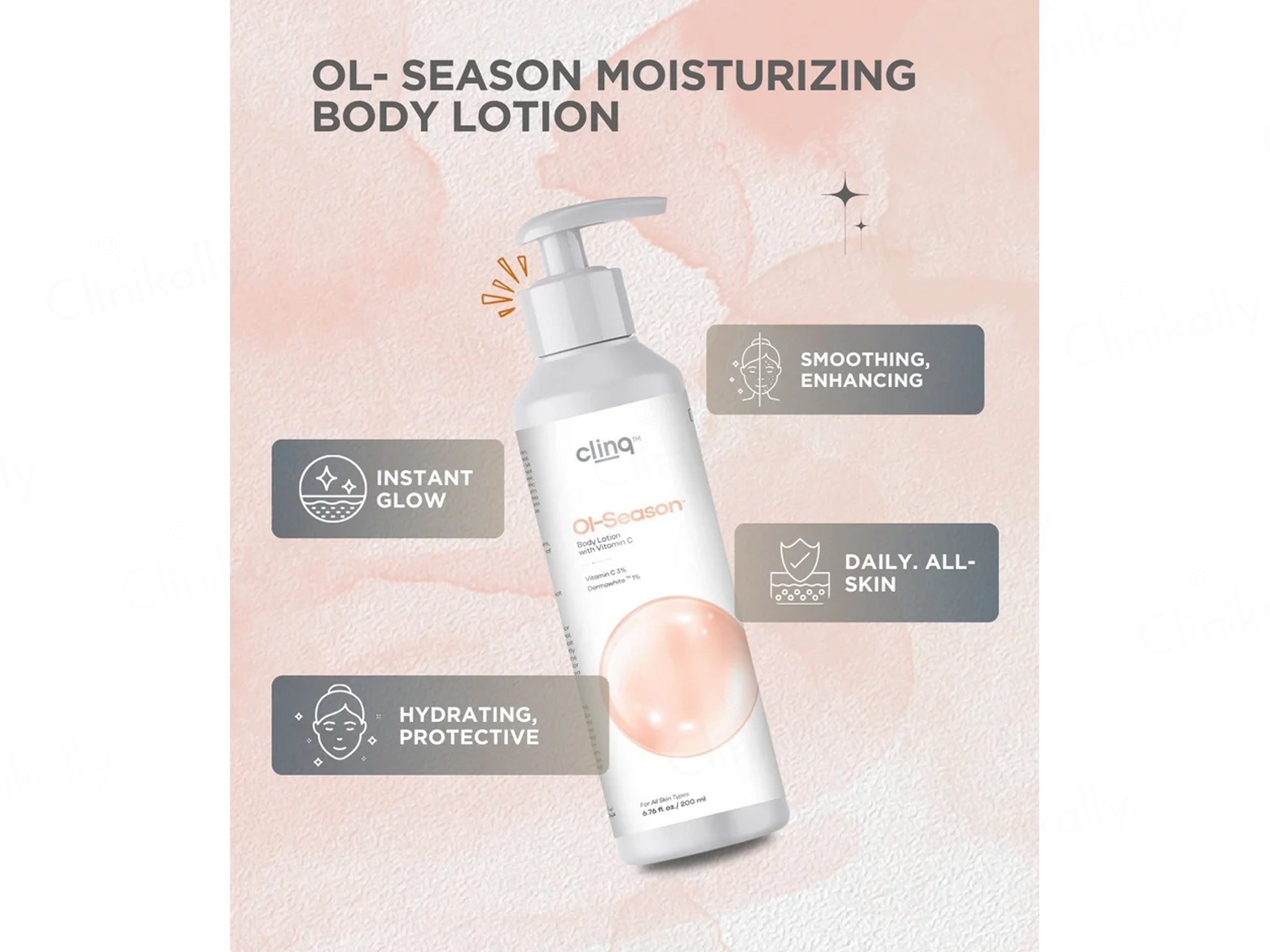 Clinq OL-Season Vitamin C Body Lotion is a nourishing daily body care formula designed to deeply moisturize the skin, improve texture, and enhance overall radiance while supporting a smooth and healthy glow throughout the year. This lightweight yet hydrating body lotion is powered by key ingredients such as Vitamin C (3%) to help brighten skin tone and promote a more even complexion, Dermashite™ (7%) to support skin barrier repair and long-lasting moisturization, Glycerin to attract and retain moisture for soft and supple skin, and Papaya Fruit Extract to gently support skin renewal and natural glow. Its fast-absorbing, non-greasy texture makes it suitable for daily use on all skin types, helping combat dryness, roughness, and dullness when applied regularly after bathing, leaving the skin feeling smooth, hydrated, and visibly refreshed.
